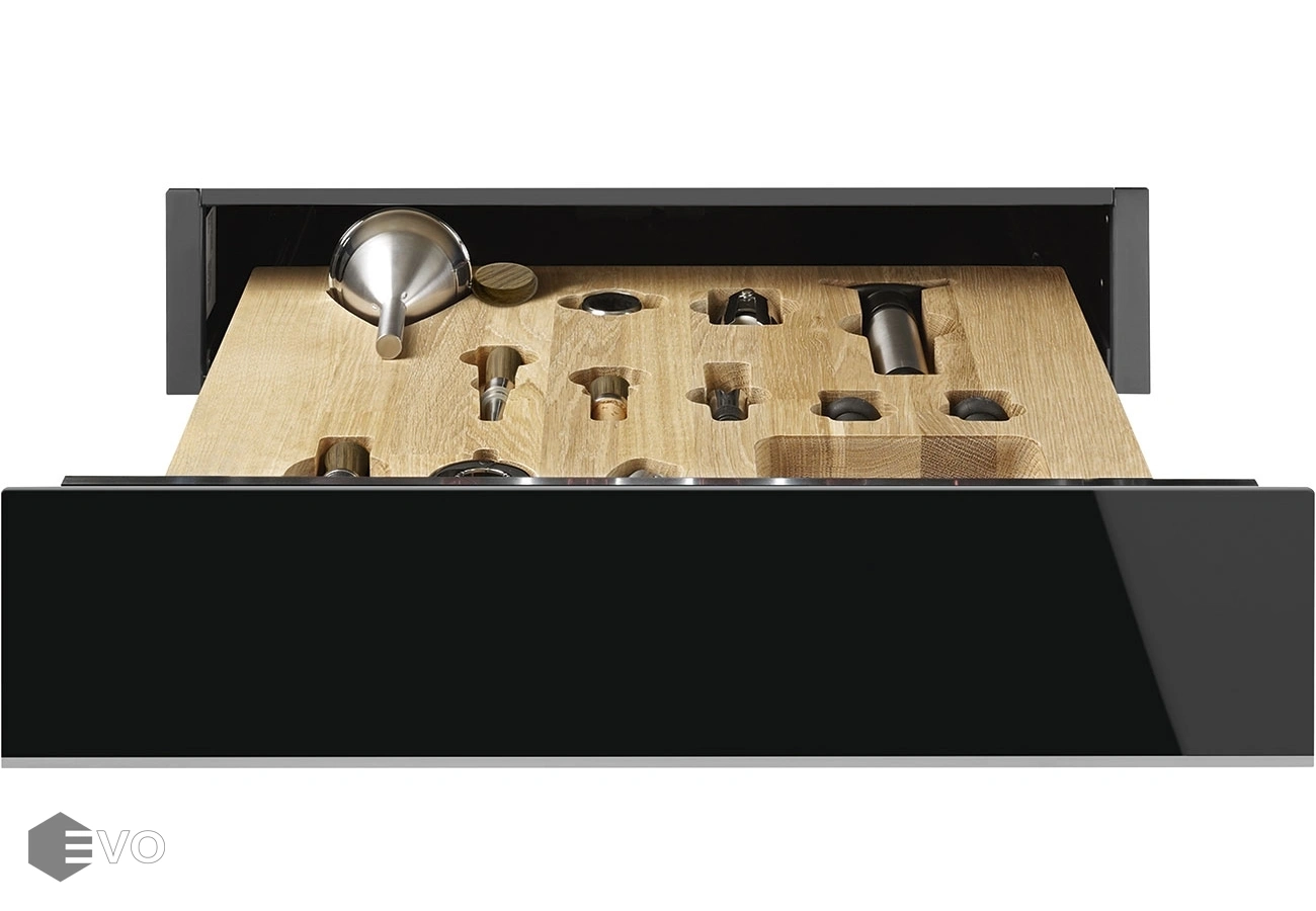 Ящик сомелье Smeg CPS615NX – аксессуар для хранения набора сомелье, в комплекте идет профессиональный набор аксессуаров для проведения дегустации винных напитков. Особенности модели: деревянный футляр для хранения аксессуаров, механизм открывания Push-Pull. Черное глянцевое стекло декорированное нержавеющей сталью подчеркивает утонченность дизайна. Фасад ящика непривередлив в уходе, конструкция надежна и стойка к внешним механическим воздействиям.