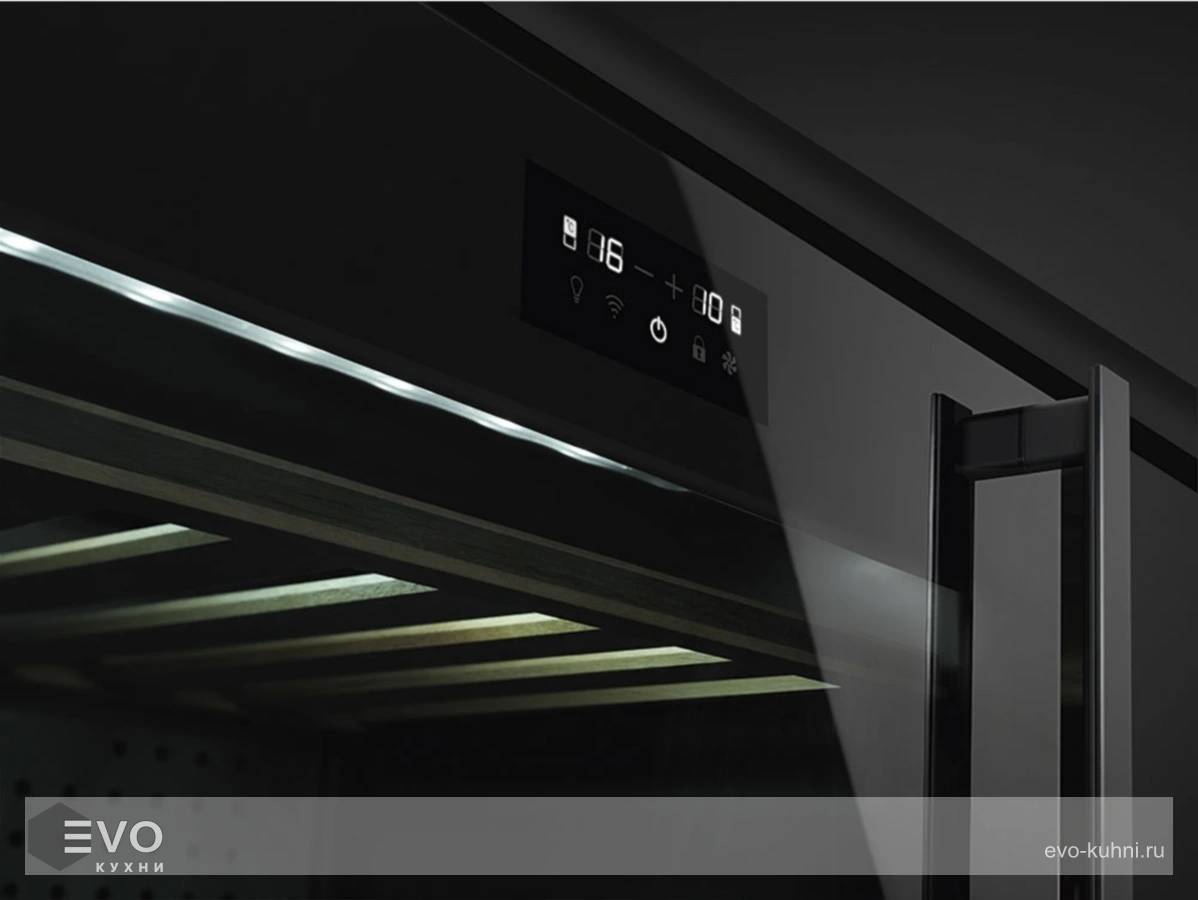 На фасаде расположен сенсорный дисплей, заданная температура поддерживается с безупречной точностью, в случае незапланированного понижения раздается сигнал оповещения. Внутри пространство разделено на 2 температурные зоны, расположение полок из дерева можно регулировать. Яркий свет красиво подсвечивает бутылки с вином – такой шкаф можно устанавливать в небольших кафе, барах и ресторанах.