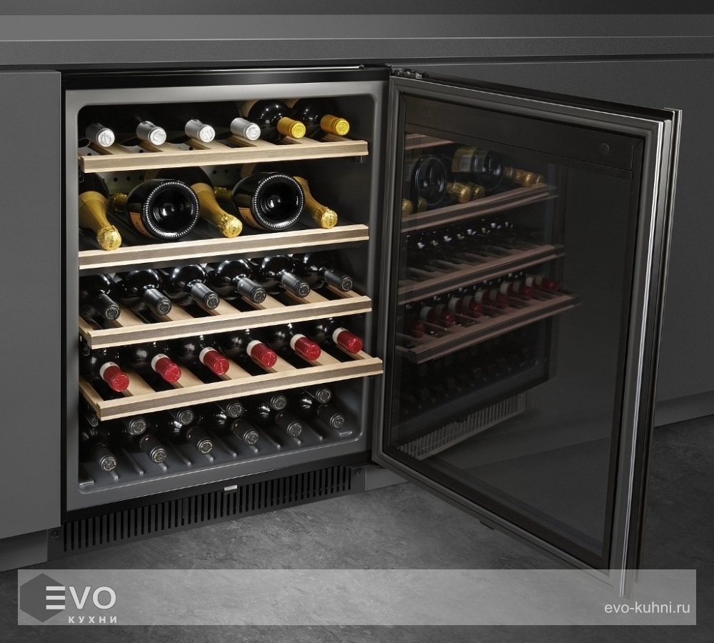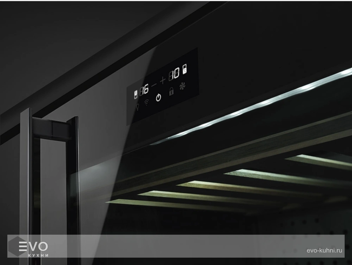На фасаде расположен сенсорный дисплей, заданная температура поддерживается с безупречной точностью, в случае незапланированного понижения раздается сигнал оповещения. Внутри пространство разделено на 2 температурные зоны, расположение полок из дерева можно регулировать. Яркий свет красиво подсвечивает бутылки с вином – такой шкаф можно устанавливать в небольших кафе, барах и ресторанах.