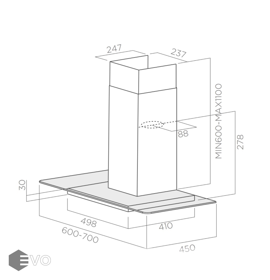 • Вытяжной вентилятор обеспечивает производительность до 700 куб. м в час, что гарантирует быстрое очищение воздуха в кухонном помещении среднего размера.