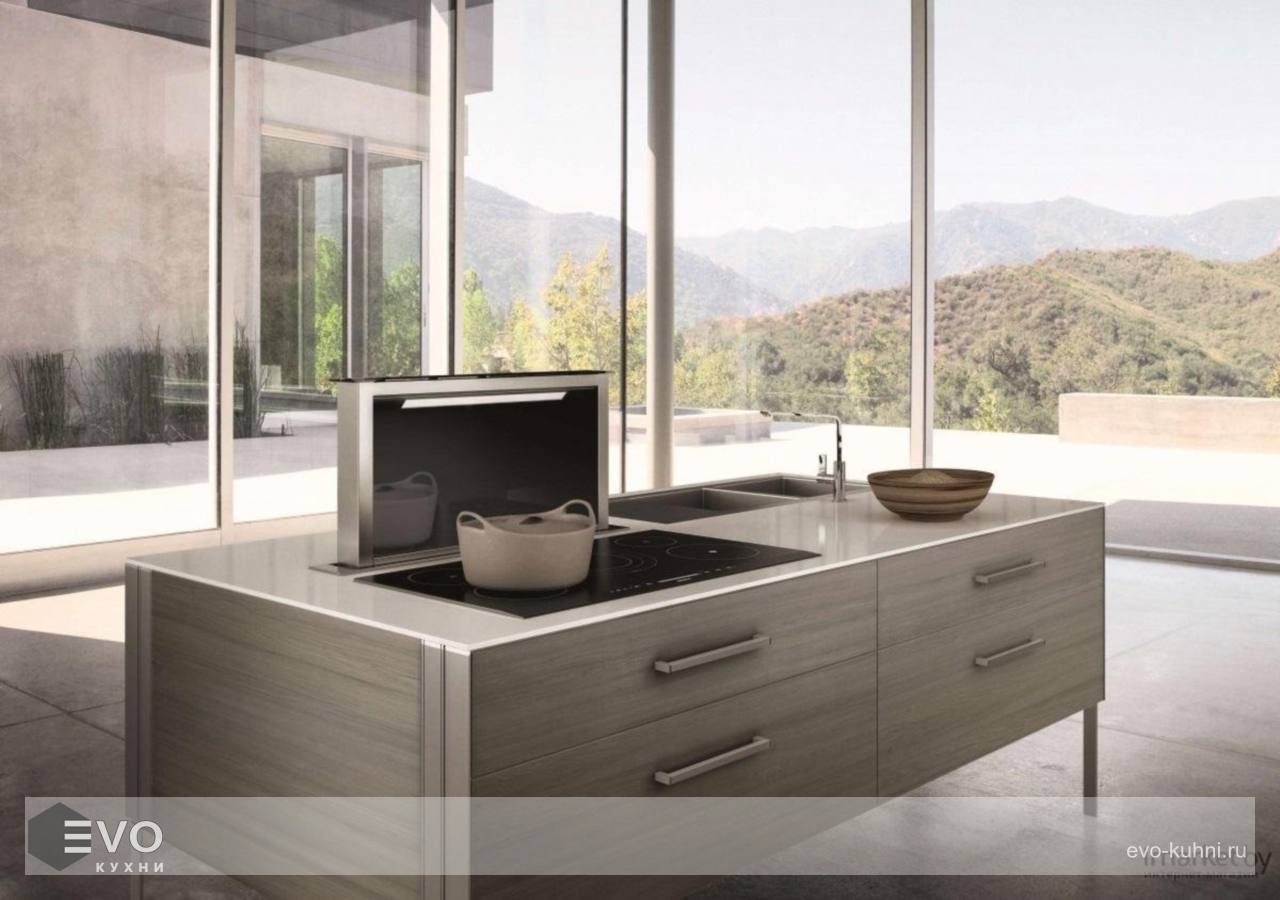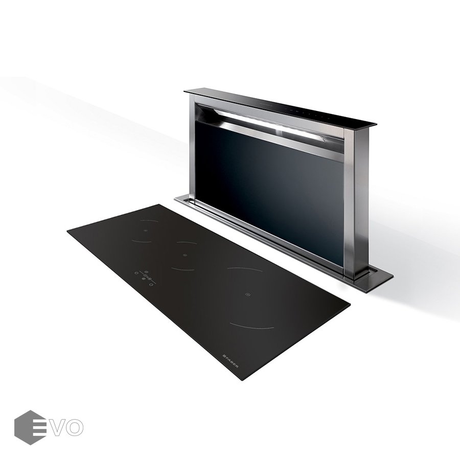 Корпус, мотор и другие элементы вытяжки Fabula скрыты под столешницей. Когда модель не работает, на поверхности видно только узкую полоску стекла с сенсорным управлением, которая выглядит продолжением варочной поверхности. При включении, с помощью скрытых моторов, панель поднимается вертикально вверх, появляется рабочая поверхность и включается светодиодная подсветка, образуя уютный и невероятно функциональный угол.