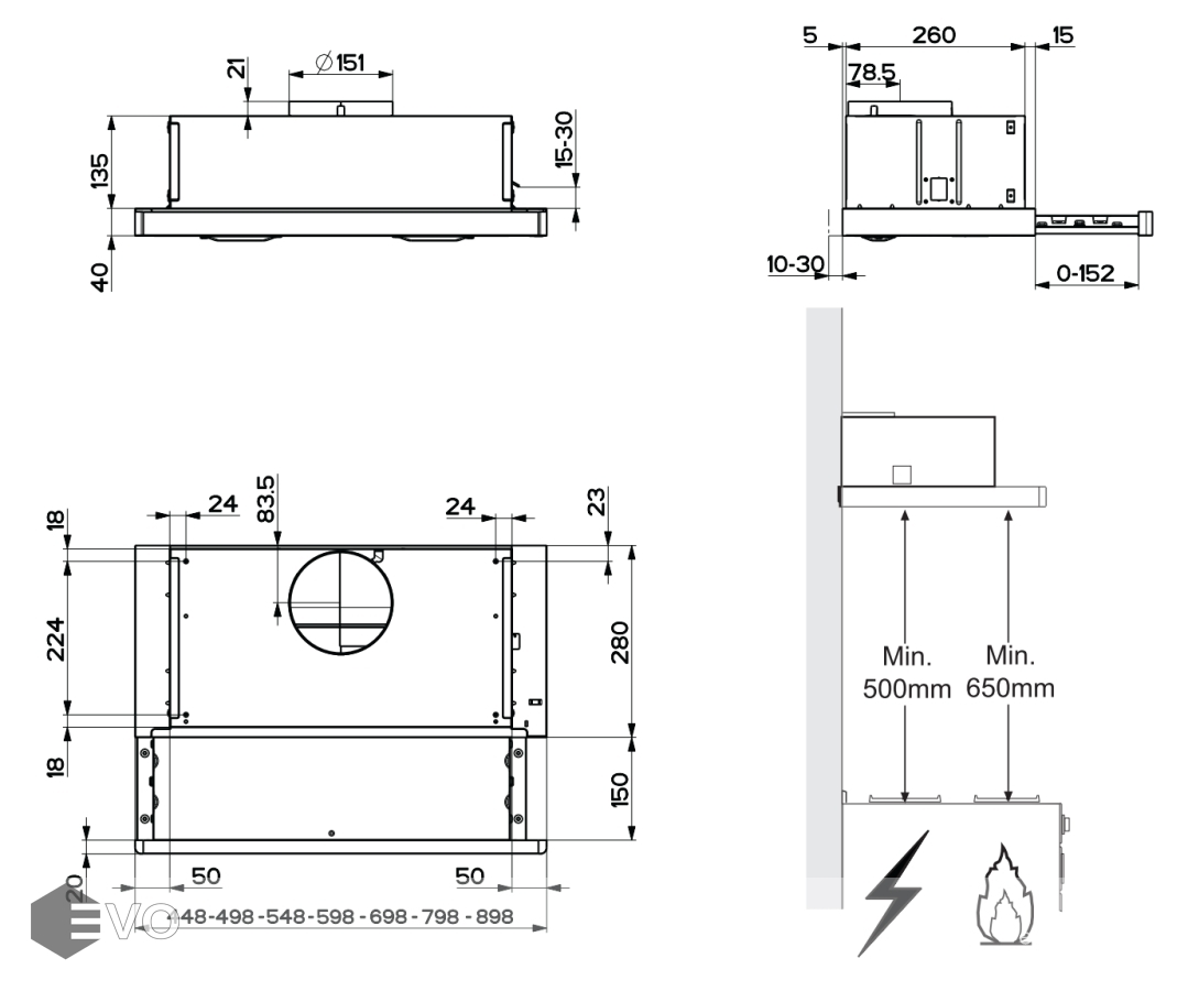 - Высота установки над электрическими варочными поверхностями, мм: 500