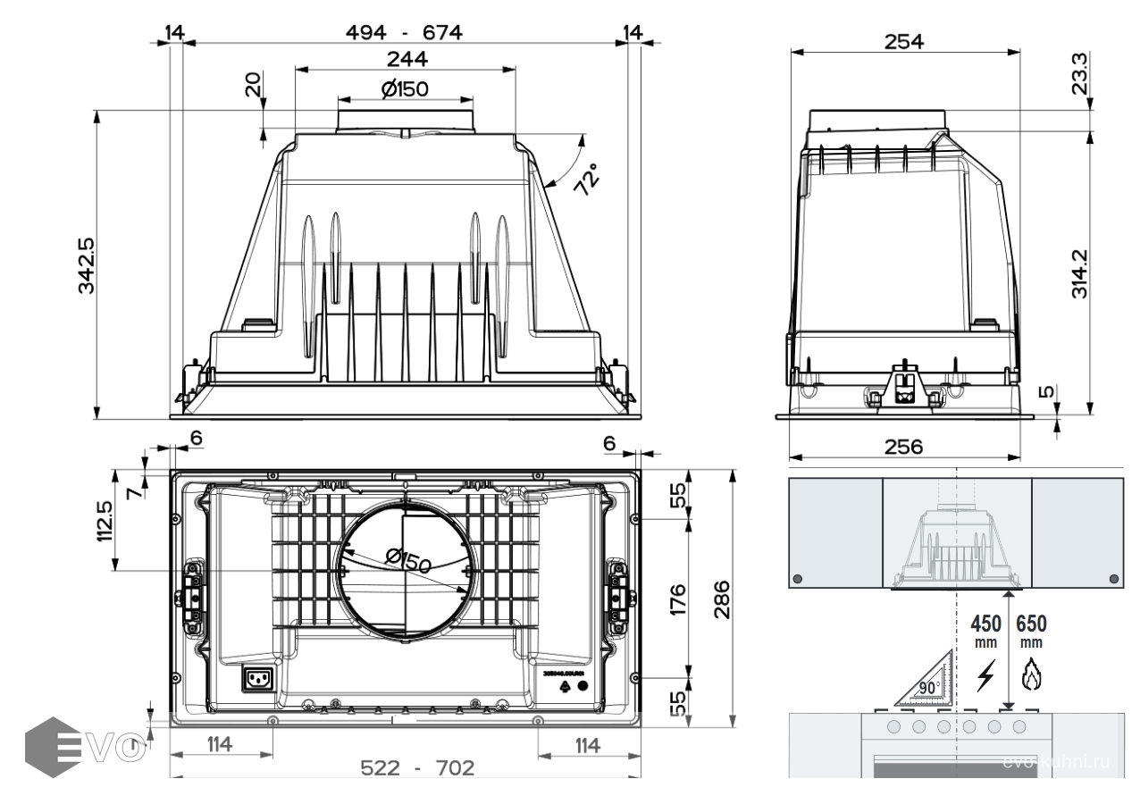 - Высота установки над газовыми варочными поверхностями, мм: 650