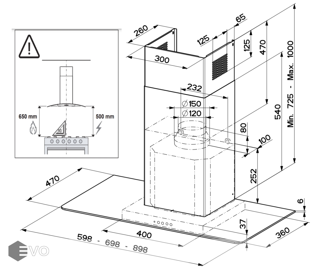 • Высота установки над электрическими варочными поверхностями, мм: 500