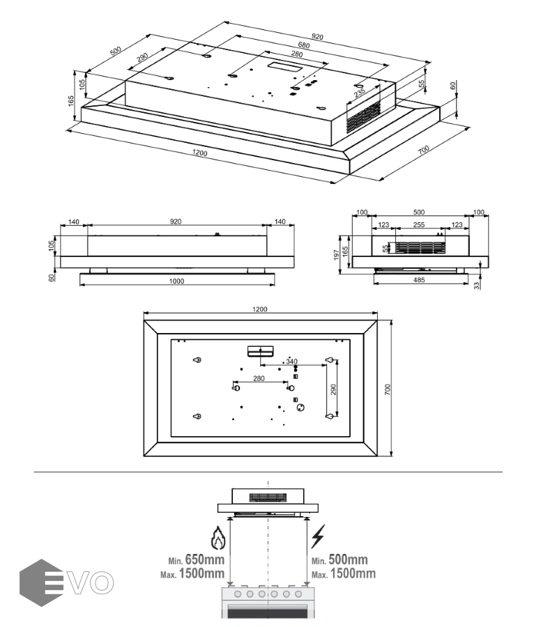 - Высота установки над электрическими варочными поверхностями, мм: 500
