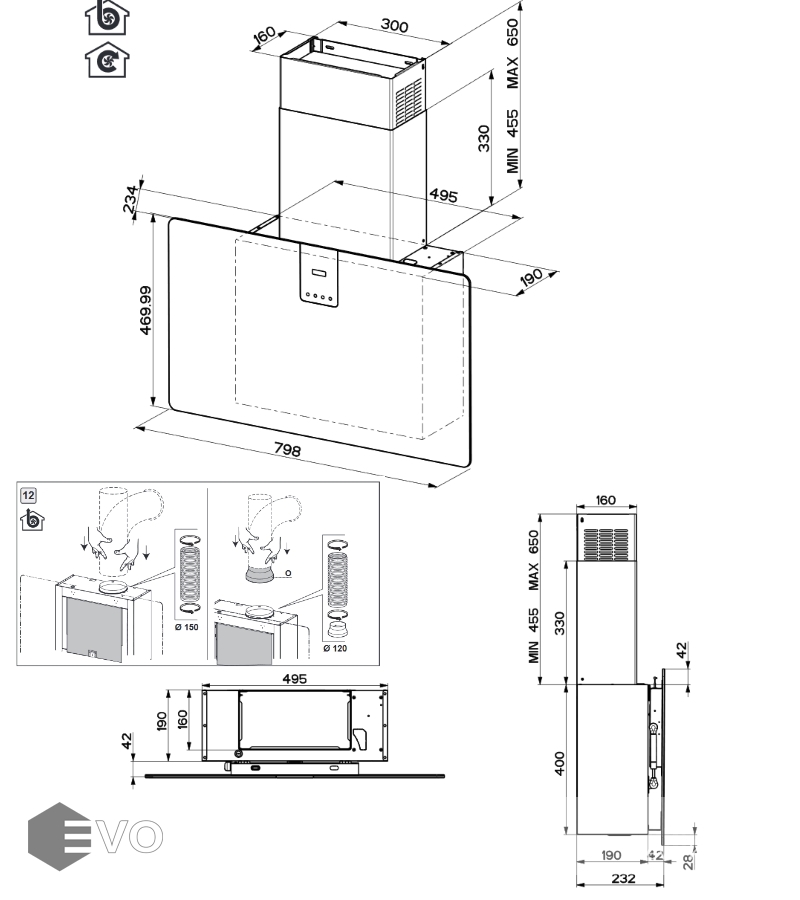 - Высота установки над электрическими варочными поверхностями, мм: 650