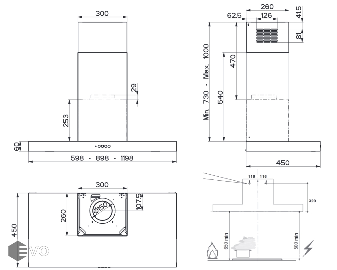 - Высота установки над электрическими варочными поверхностями, мм: 500
