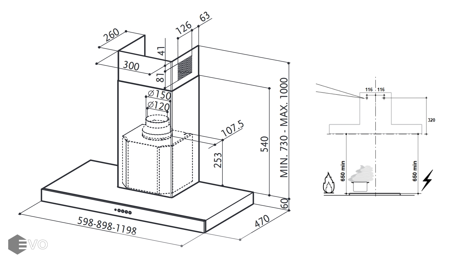 - Высота установки над электрическими варочными поверхностями, мм: 650