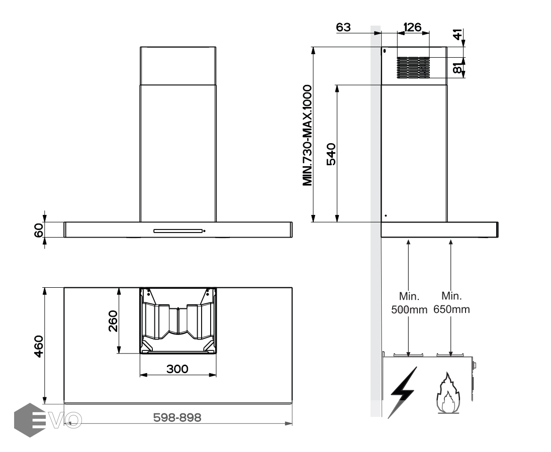 • Высота установки над электрическими варочными поверхностями, мм: 500