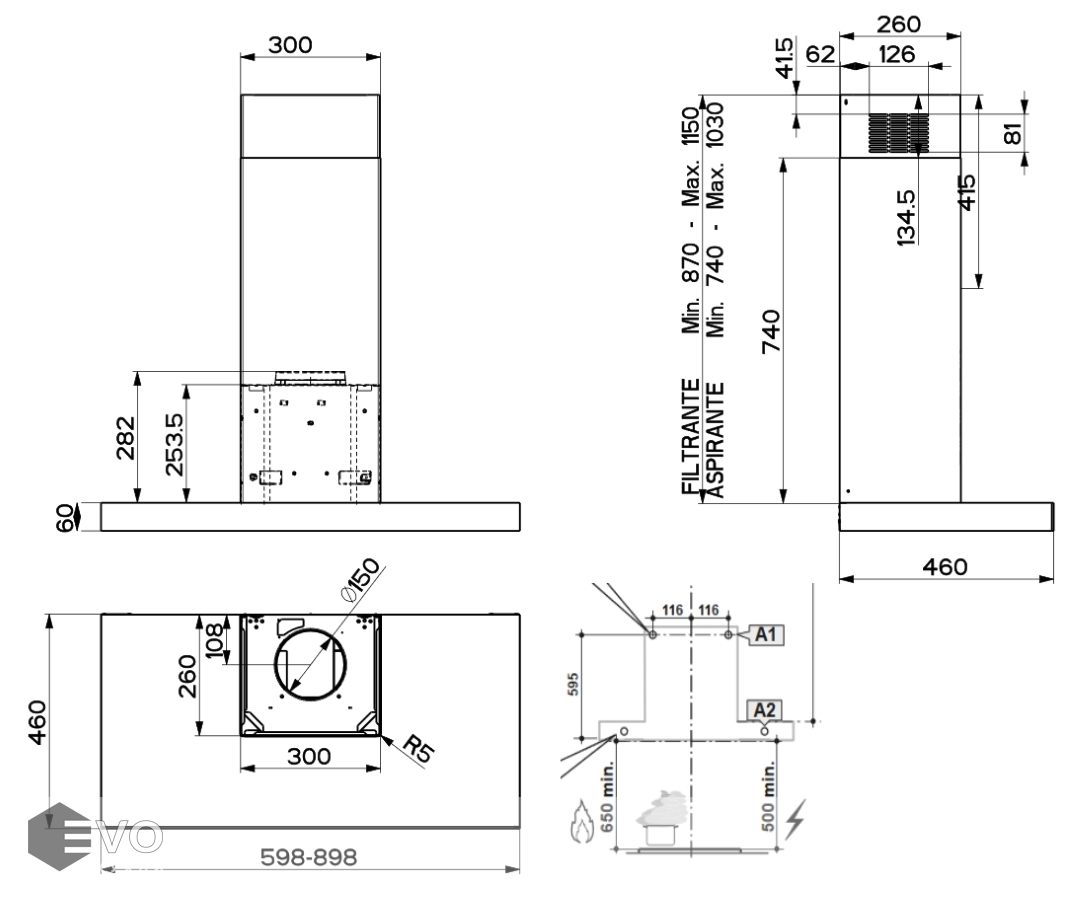- Высота установки над электрическими варочными поверхностями, мм: 500