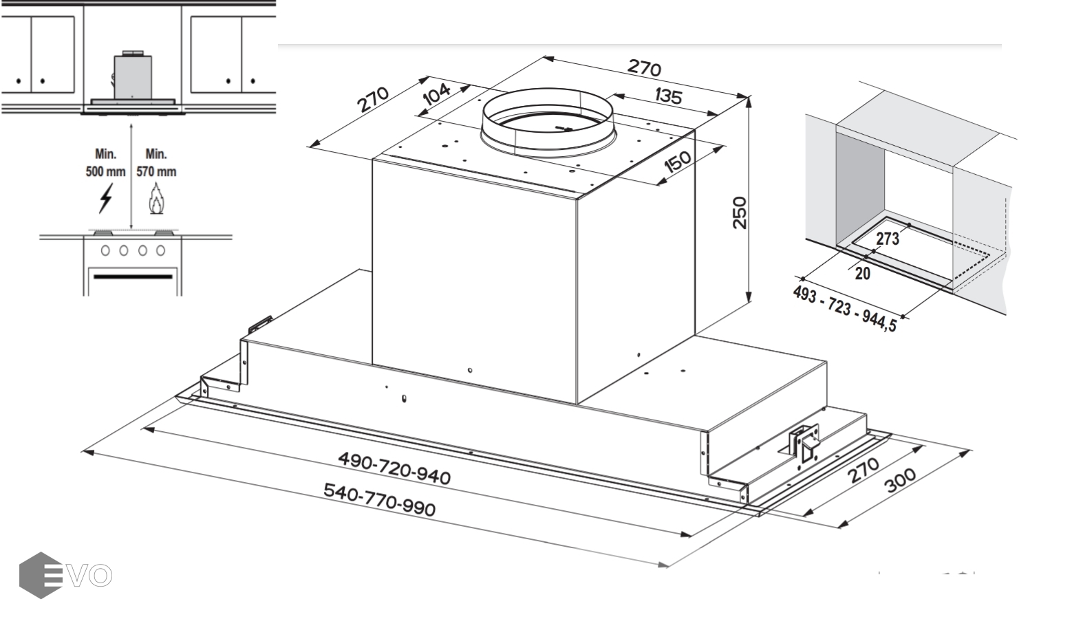 • Высота установки над газовыми варочными поверхностями, мм: 570