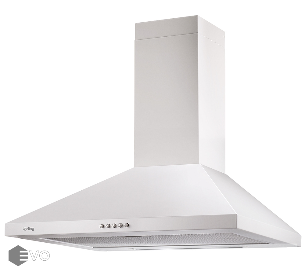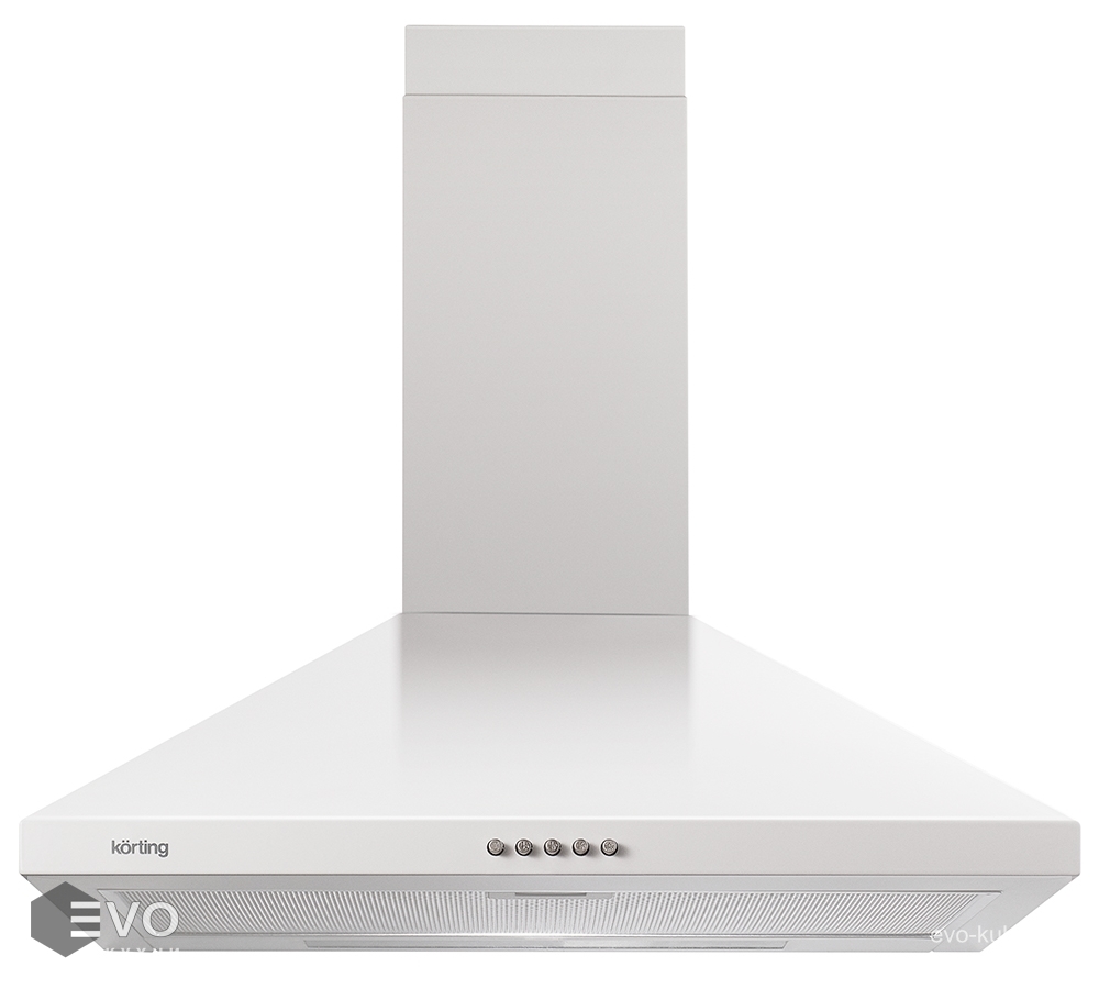 Купольная вытяжка Korting KHC 6431 W – вытяжка шириной 60 см монтируется к стене, из-за сходства с каминными дымоходами подобные модели называют приборами «каминного типа». Управление осуществляется при помощи кнопок, расположенных на передней панели.