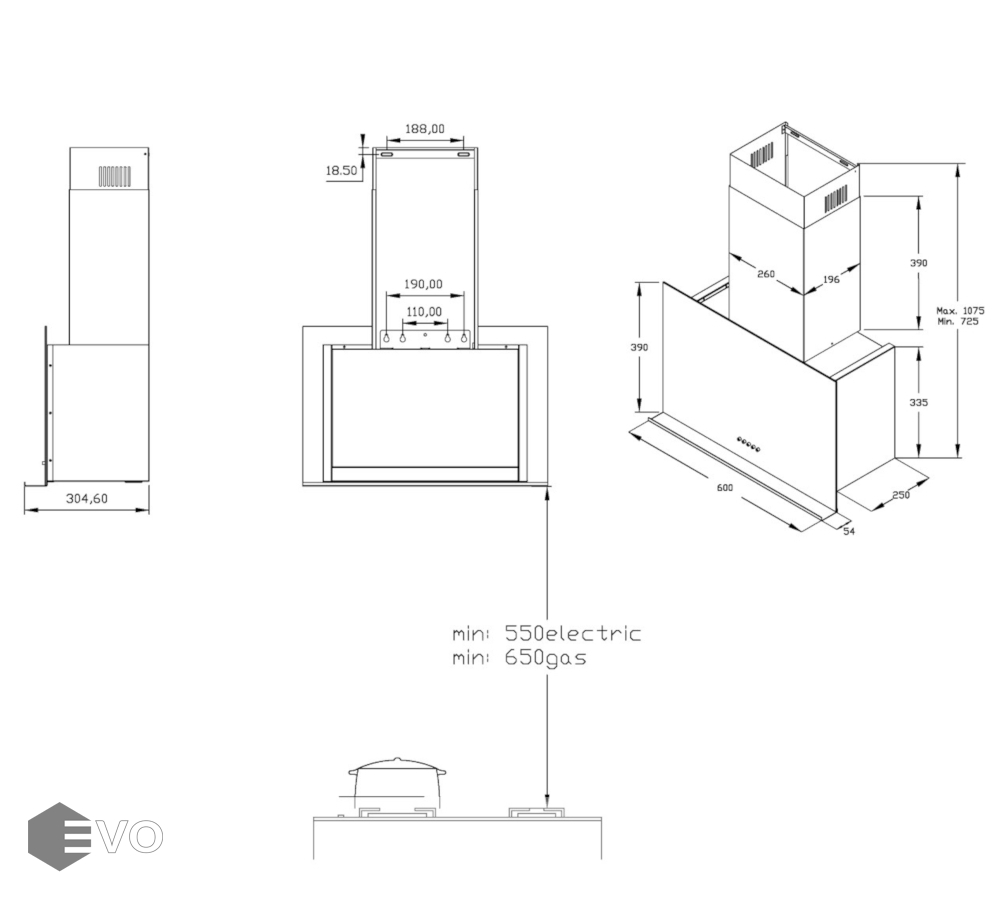 - Высота установки над электрическими варочными поверхностями, мм: 550
