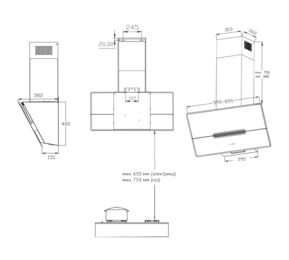 - Высота установки над газовыми варочными поверхностями, мм: 750
