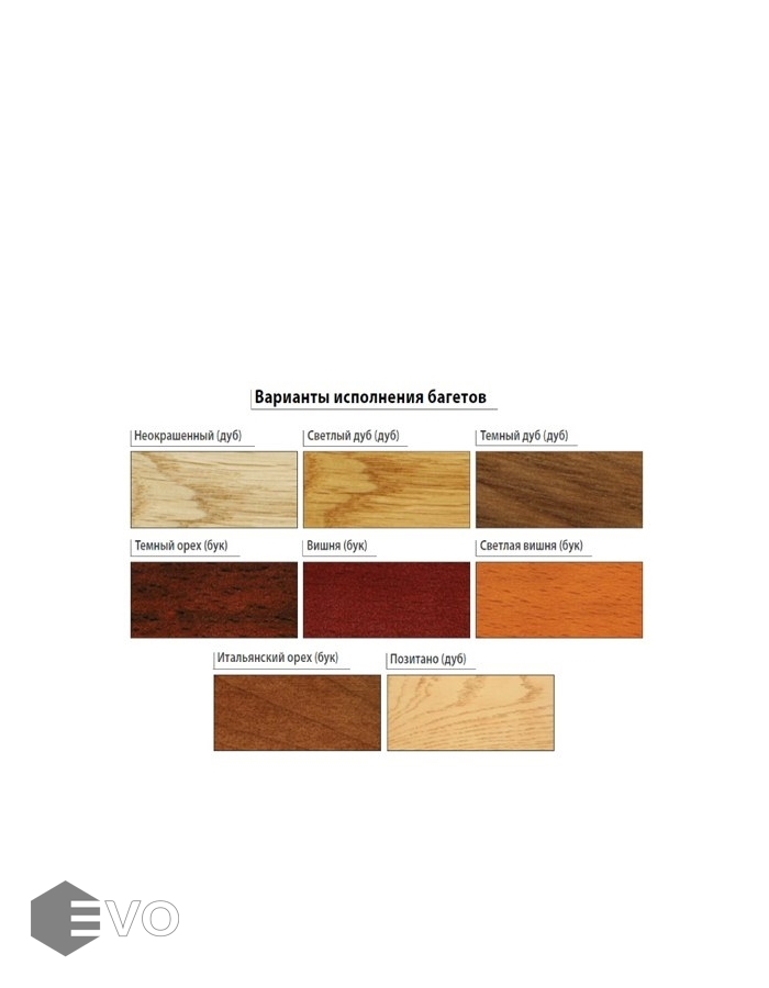 - Цвет отделки багета: итальянский орех, неокрашенный, позитано, светлый дуб, темный дуб, темный орех