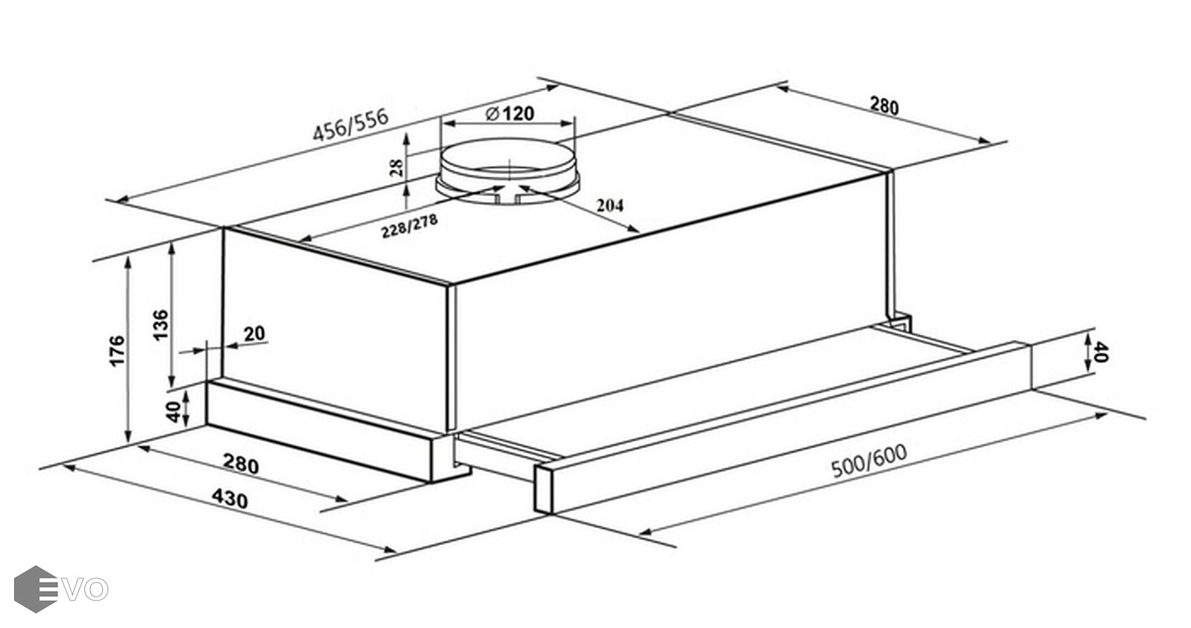 За переключение двух скоростей и включение светодиодной подсветки (1х1,5 Вт) отвечает колыбельное управление, которое находится в выдвижной части. Модель может работать в режиме прямого отвода или в режиме рециркуляции воздуха.
