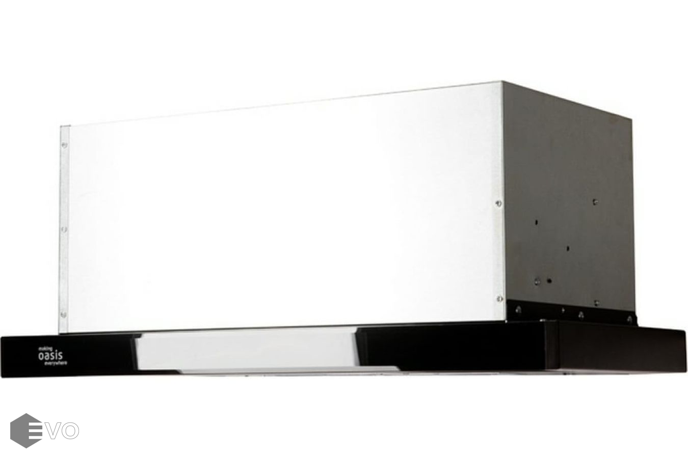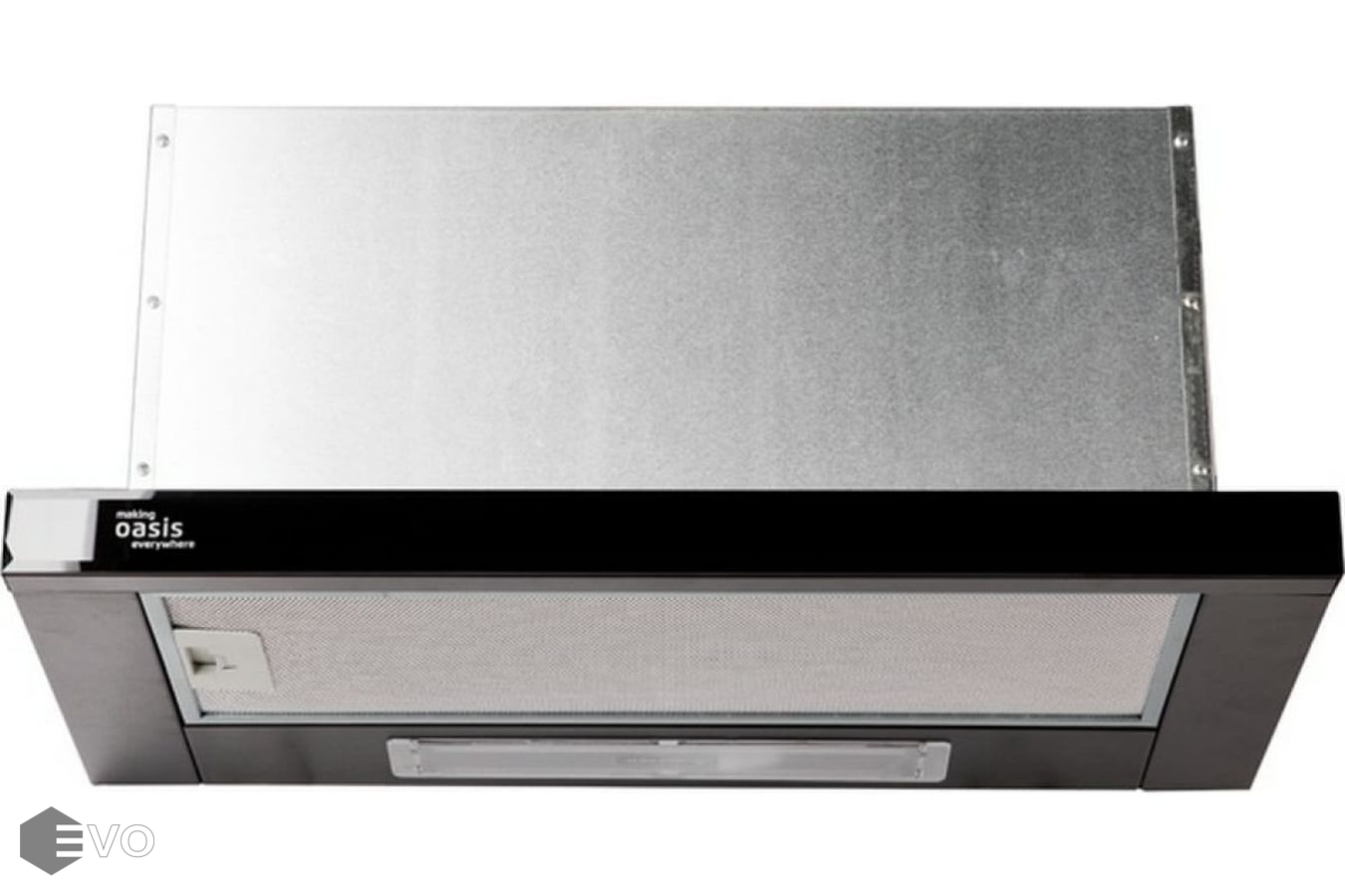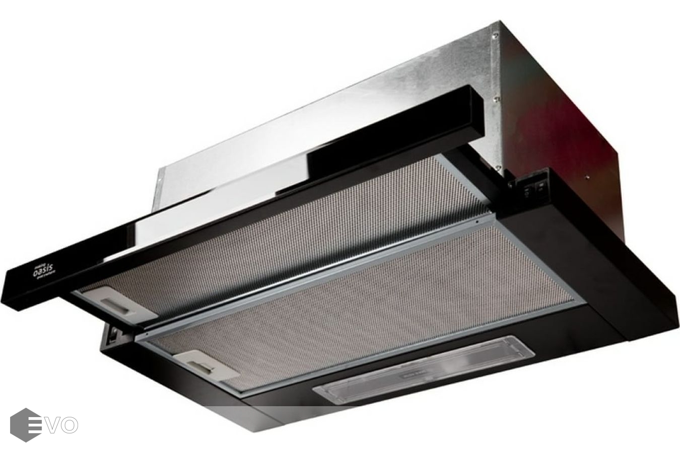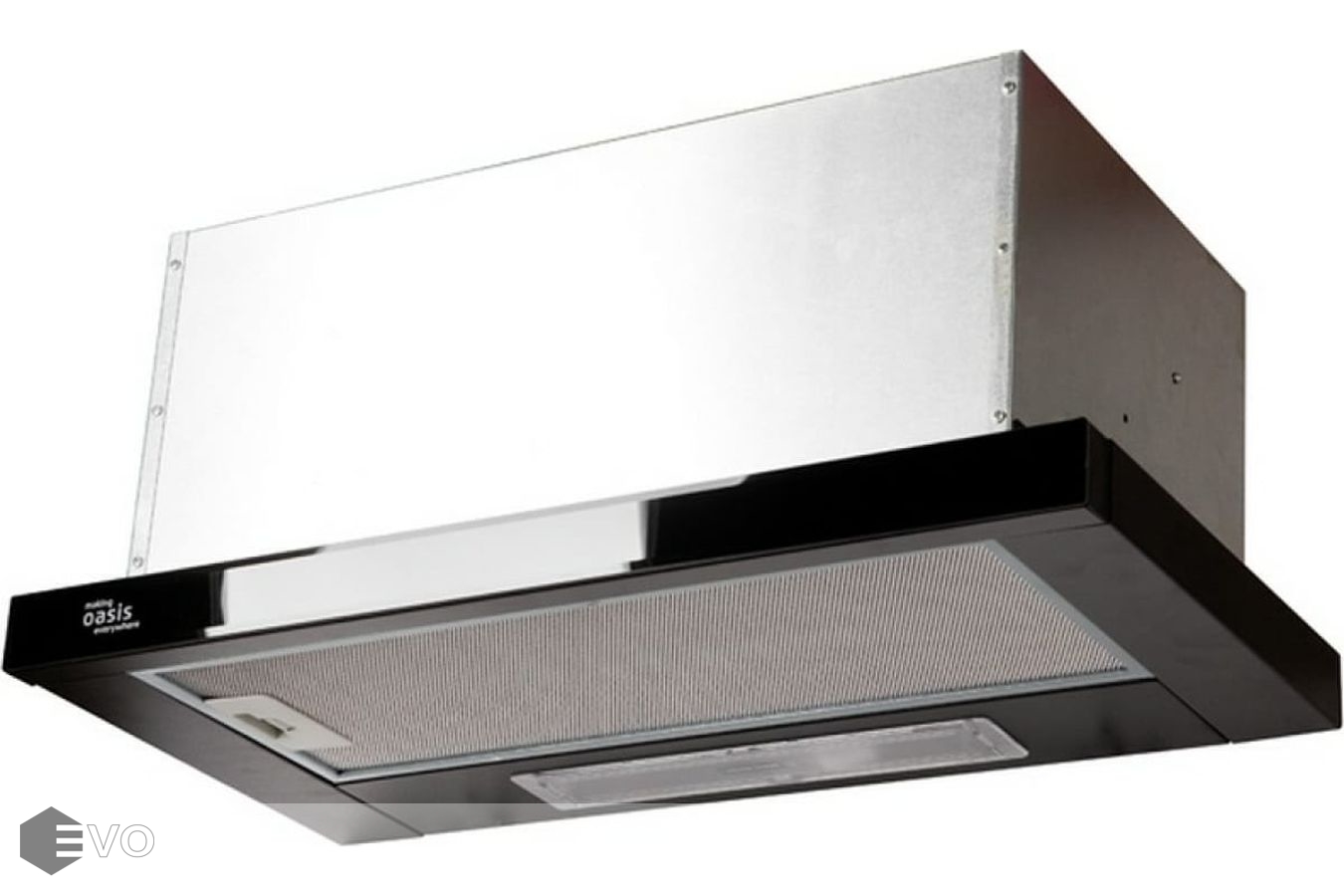 Кухонная вытяжка OASIS "making Оasis everywhere" VT-60BG (F) довольно компактна и монтируется в специальный навесной шкаф над плитой. При этом "на виду" остаётся лишь узкая панель, которая выдвигается вперёд при работе вытяжки. Это нужно для более полного охвата поверхности плиты, чтобы грязный воздух не поднимался к потолку.