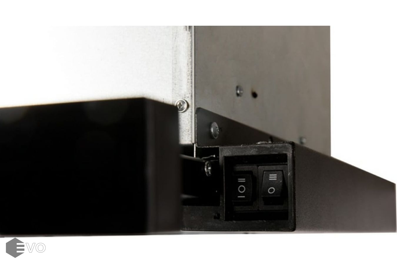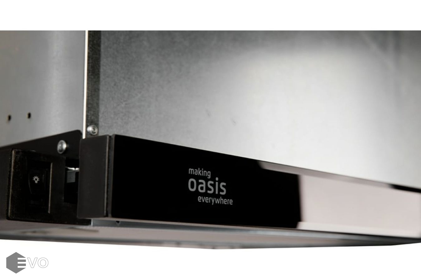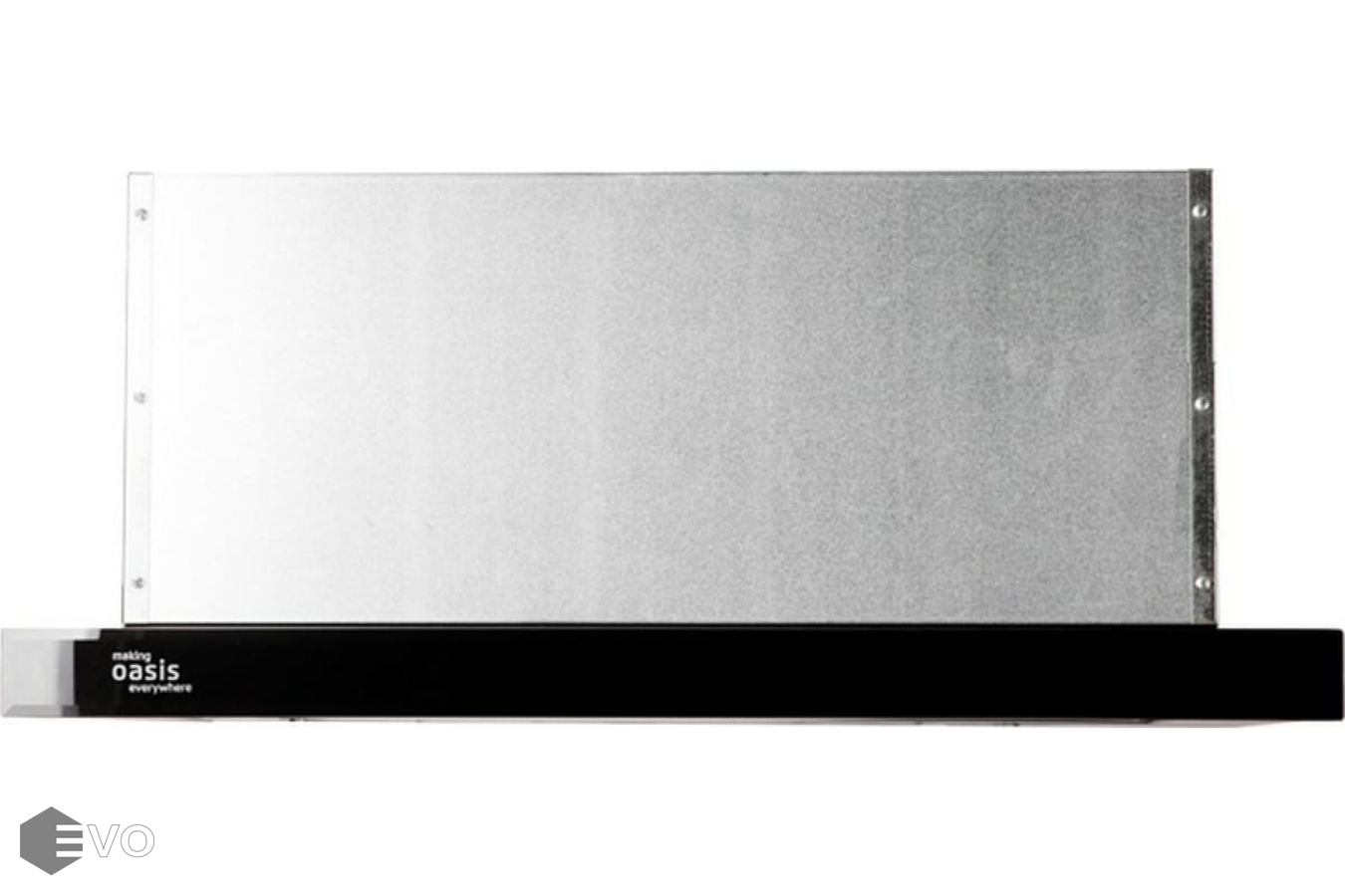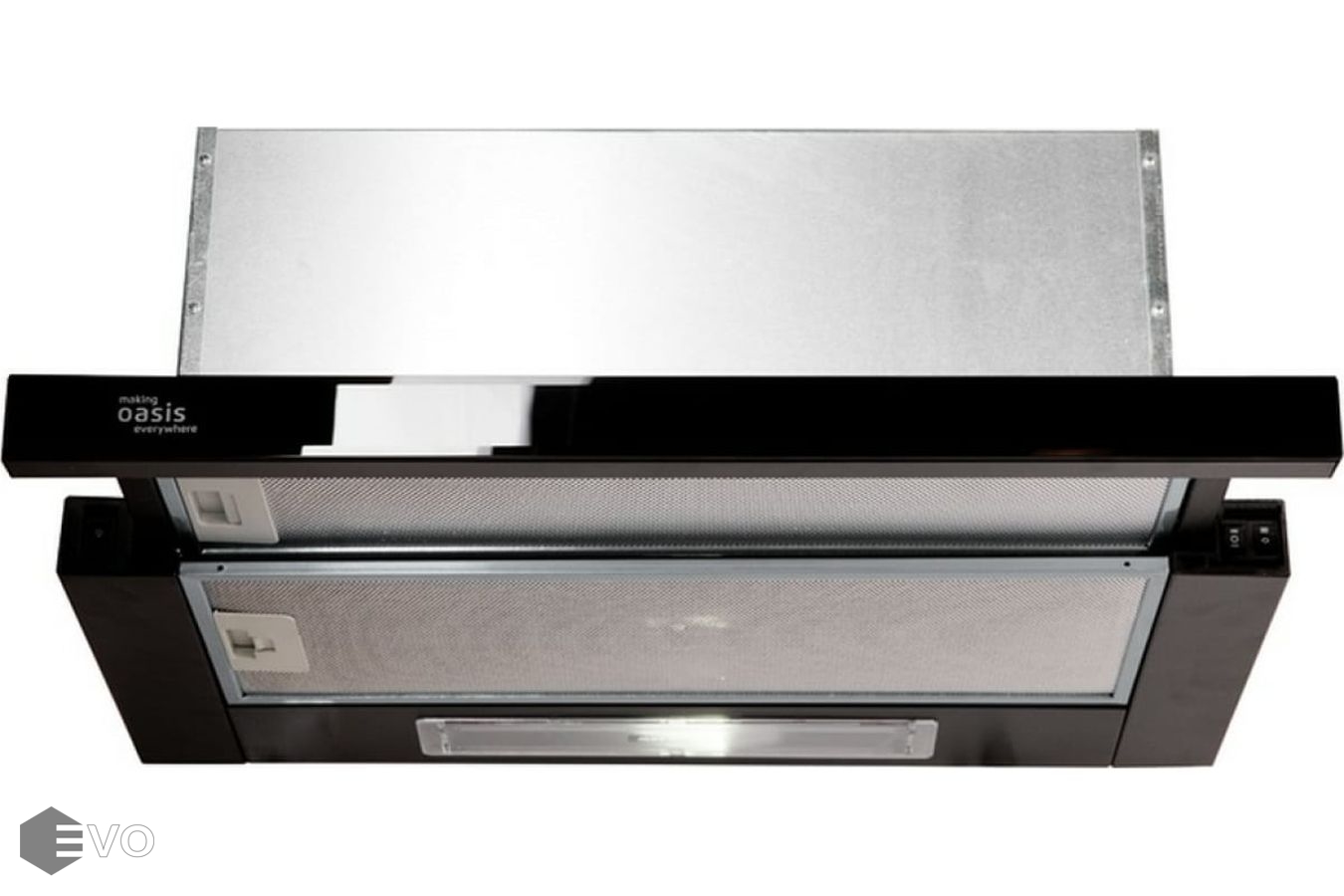 Кухонная вытяжка OASIS "making Оasis everywhere" VT-60BG (F) довольно компактна и монтируется в специальный навесной шкаф над плитой. При этом "на виду" остаётся лишь узкая панель, которая выдвигается вперёд при работе вытяжки. Это нужно для более полного охвата поверхности плиты, чтобы грязный воздух не поднимался к потолку.