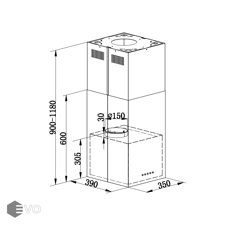 Кнопочное управление, расположенное на панели освещения, позволяет выбрать одну из 3-х скоростей работы вентилятора и включить освещение. Корпус, выполненный из матированной нержавеющей стали, крепится на потолок над поверхностью плиты. Алюминиевый многослойный жироулавливающий фильтр находится в нижней части вытяжки