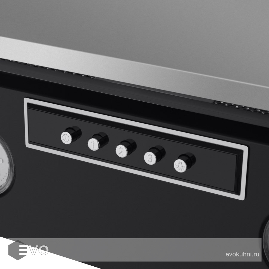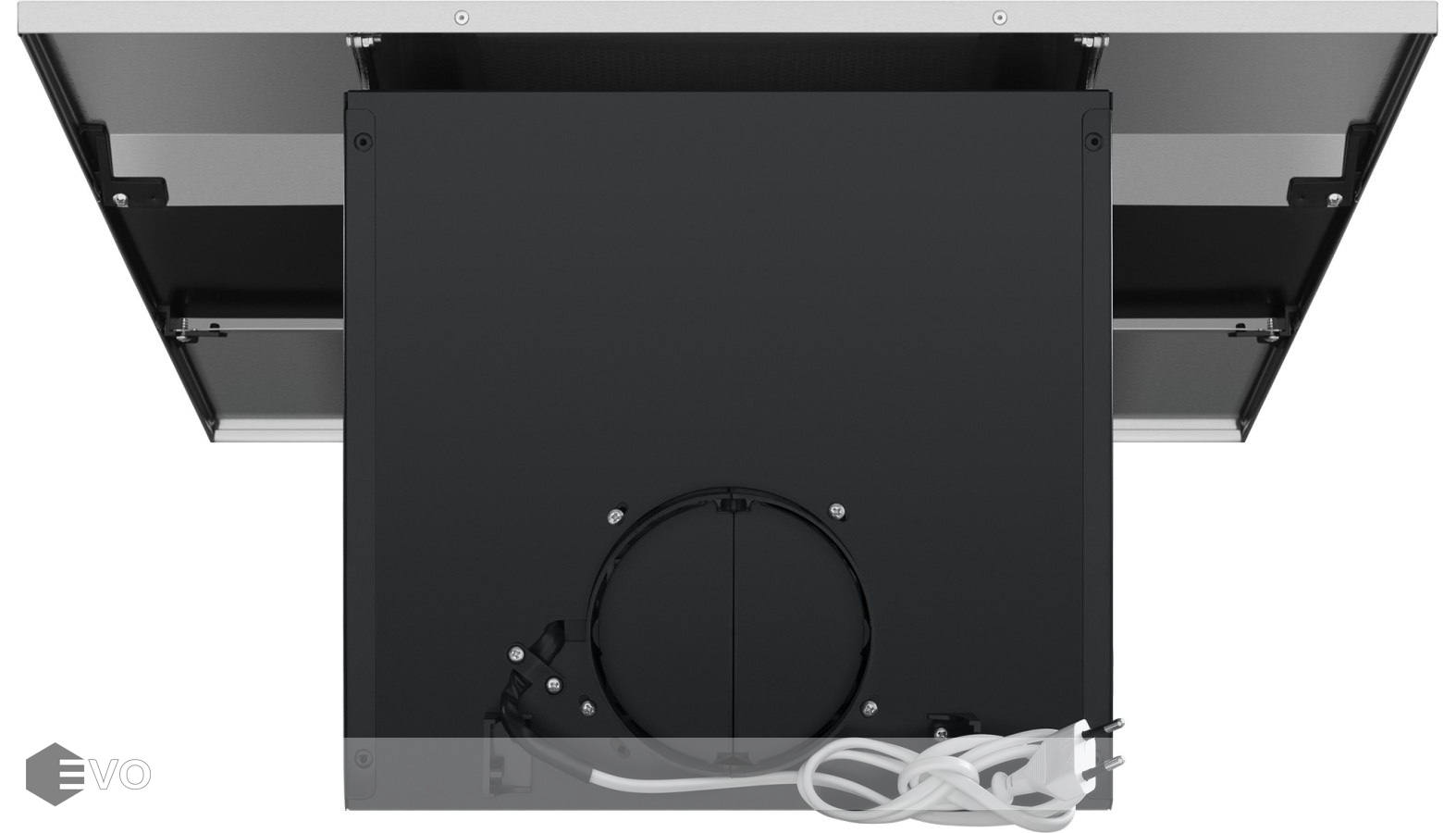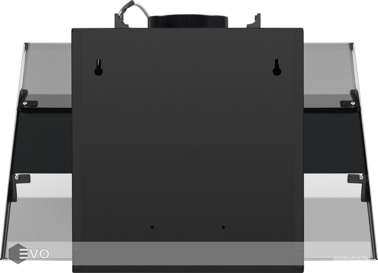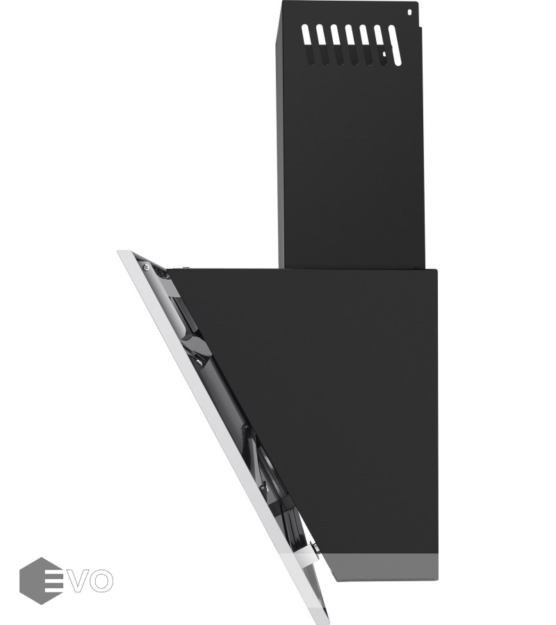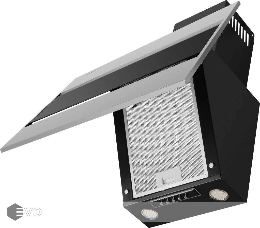 Корпус выполнен из металла с эмалевым покрытием черного цвета. Откидная панель из матированной нержавеющей стали со вставкой из закаленного черного стекла, скрывает многослойный алюминиевый жироулавливающий фильтр. Он легко снимается и полностью разбирается, что сильно упрощает его чистку. Загрязненный воздух втягивается по периметру откидной панели. Кнопочное управление, расположенное на панели освещения, позволяет выбрать одну из 3-х скоростей работы вентилятора и включить освещение (два светодиодных источника по 3 Вт).