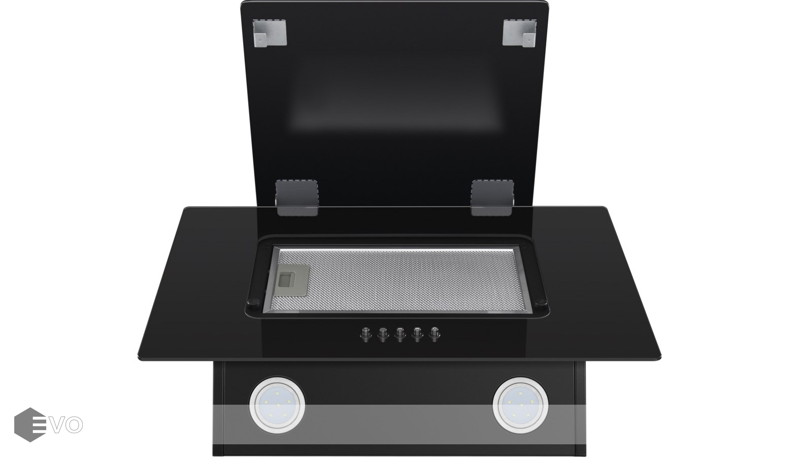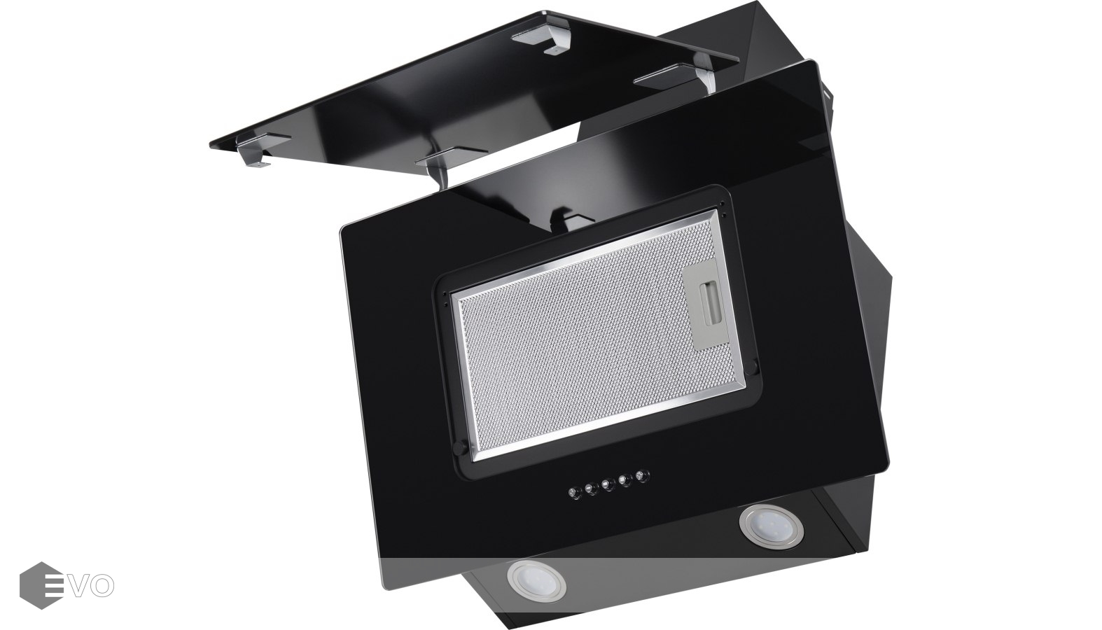 Корпус из нержавеющей стали выполнен в едином цвете с 2-мя фронтальными панелями из закаленного стекла черного цвета. Откидная панель надежно фиксируется магнитными защелками и скрывает алюминиевый жироулавливающий фильтр, который легко снимается и полностью разбирается, что сильно упрощает чистку. Загрязненный воздух втягивается по всему периметру откидной панели.