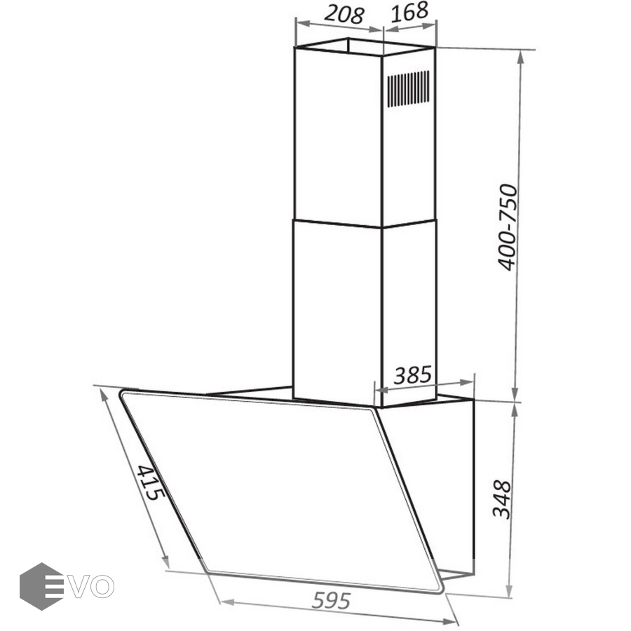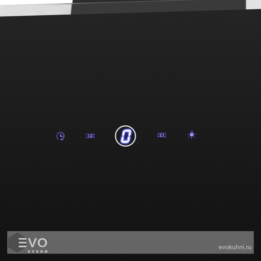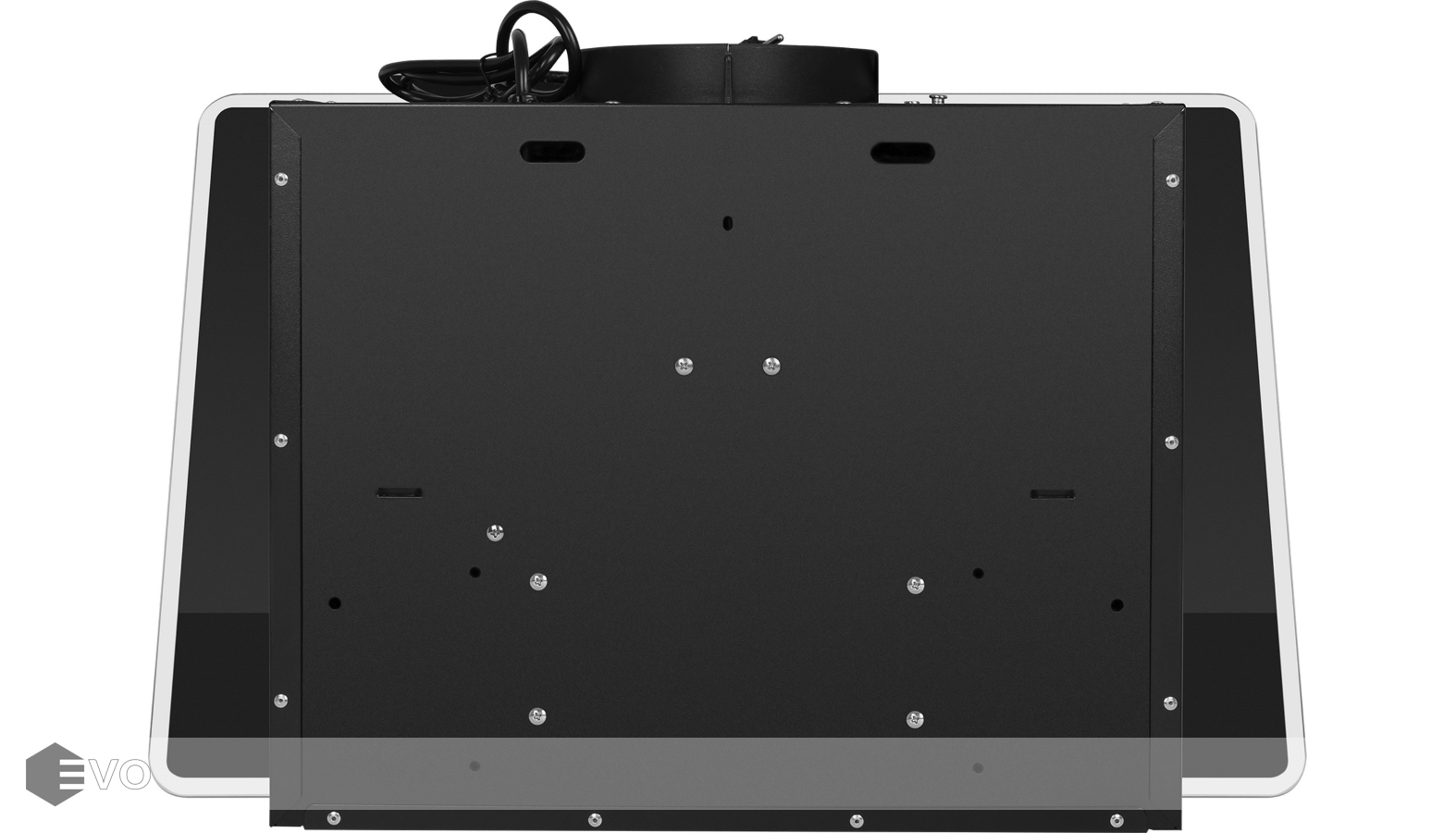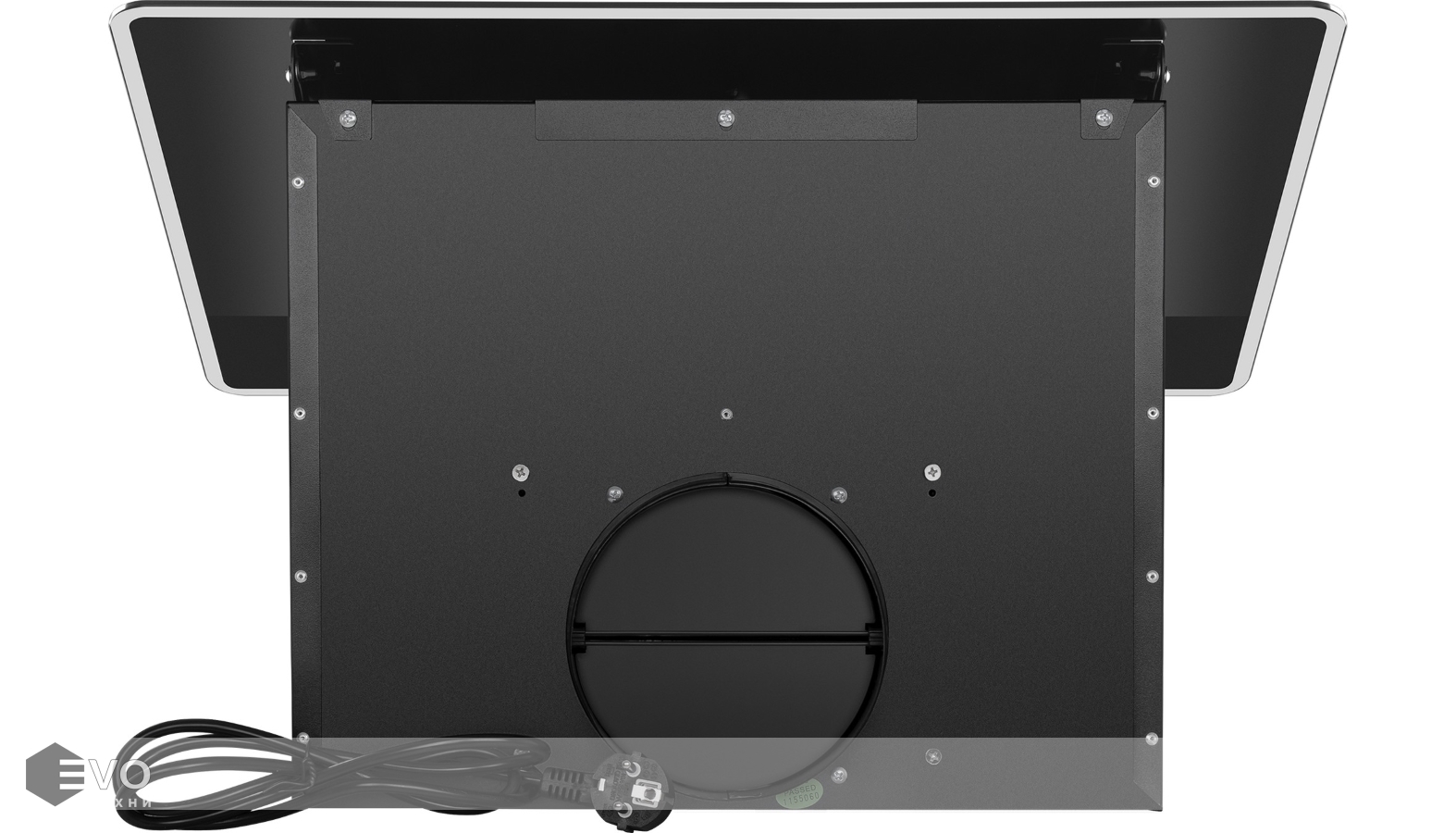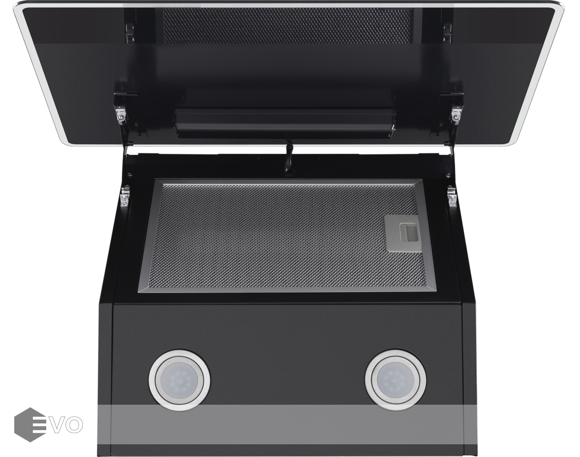 Корпус сделан из нержавеющей стали. Откидная панель выполнена из закаленного глянцевого стекла белого цвета с прозрачной окантовкой. За ней скрыт алюминиевый жироулавливающий фильтр, который легко снимается и полностью разбирается для чистки. Загрязненный воздух втягивается по периметру откидной панели. Сенсорное управление осуществляется с помощью дисплея, расположенного фасаде. Можно включить: одну из 3-х скоростей, таймер (на 9 мин), свет (2 светодиодных элемента по 1,5 Вт).