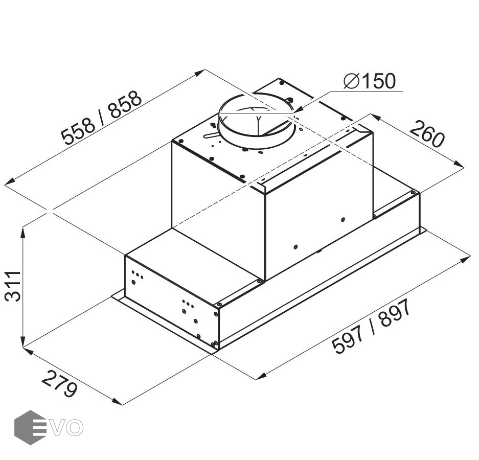 Корпус сделан из нержавеющей стали. На фасаде белого цвета находится откидная панель, выполненная из закаленного стекла. За ней располагается легко снимающийся жироулавливающий алюминиевый фильтр. Загрязненный воздух втягивается по всему периметру панели.