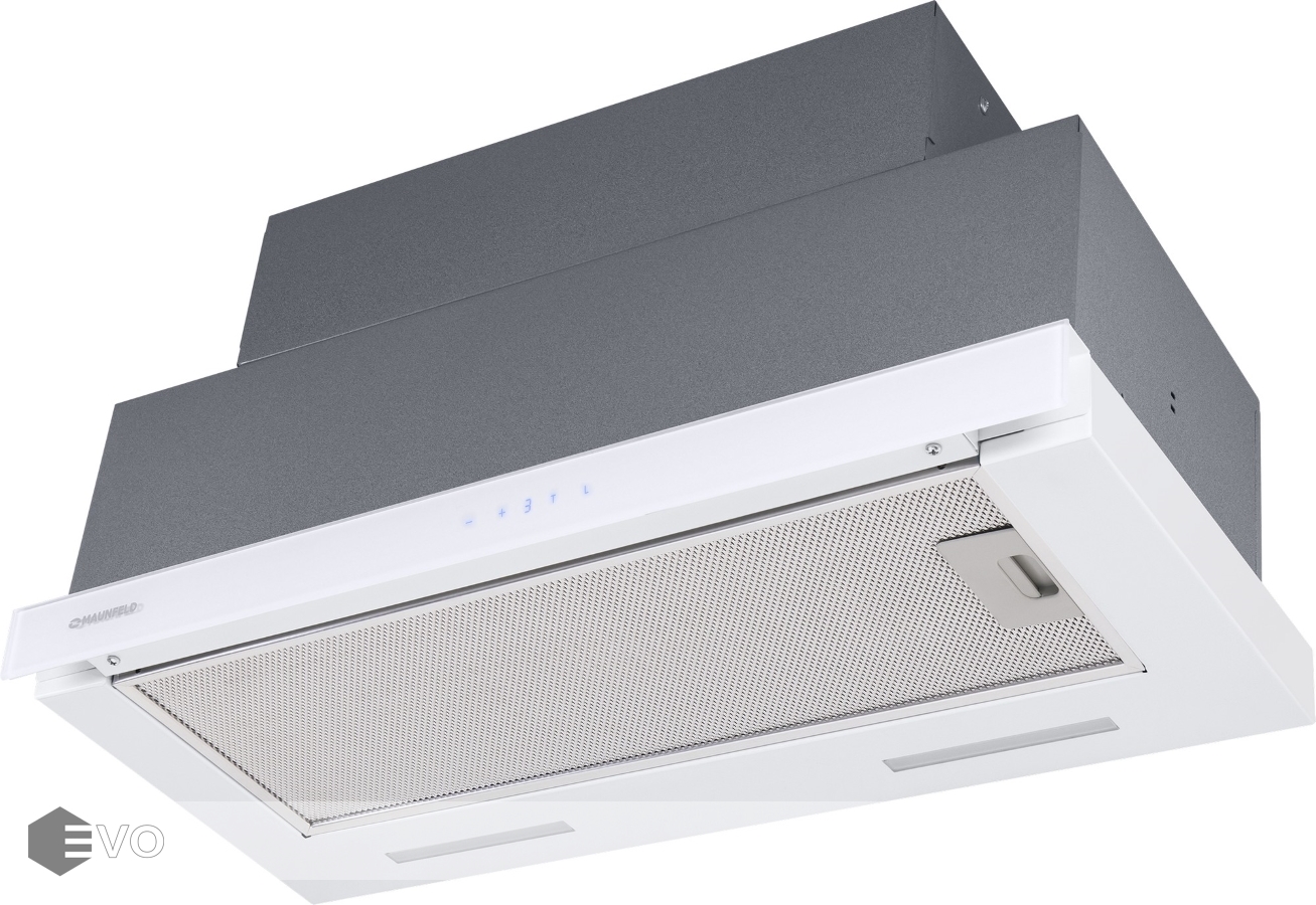 Выдвижная вытяжка MAUNFELD Galaxy 60 белый – телескопическая кухонная вытяжка с шириной 60 см благодаря выдвижному козырьку может эффективно очищать загрязненный воздух на в кухне очень большой площади (до 50 кв.м). Модель встраивается в навесной шкаф над поверхностью плиты. Работает в 2-х режимах – отвода (при подключении к системе вентиляции) и рециркуляции (при использовании сменного угольного фильтра).