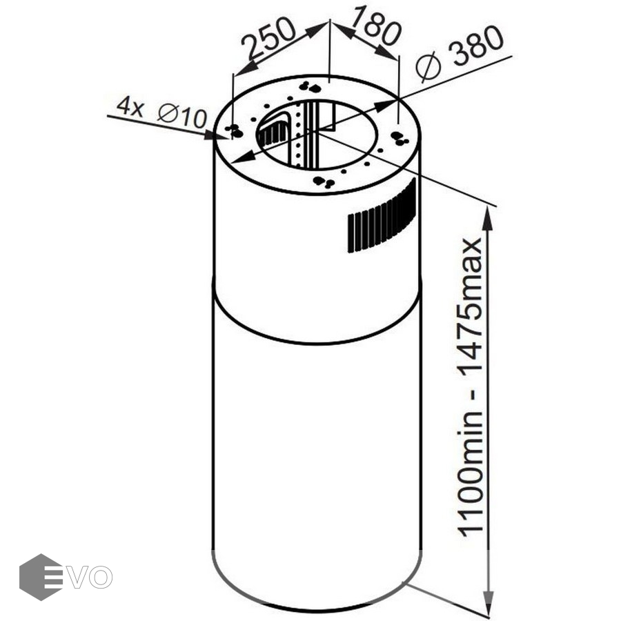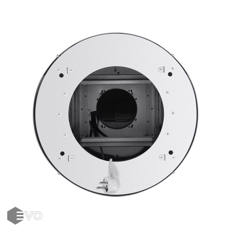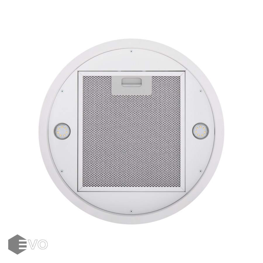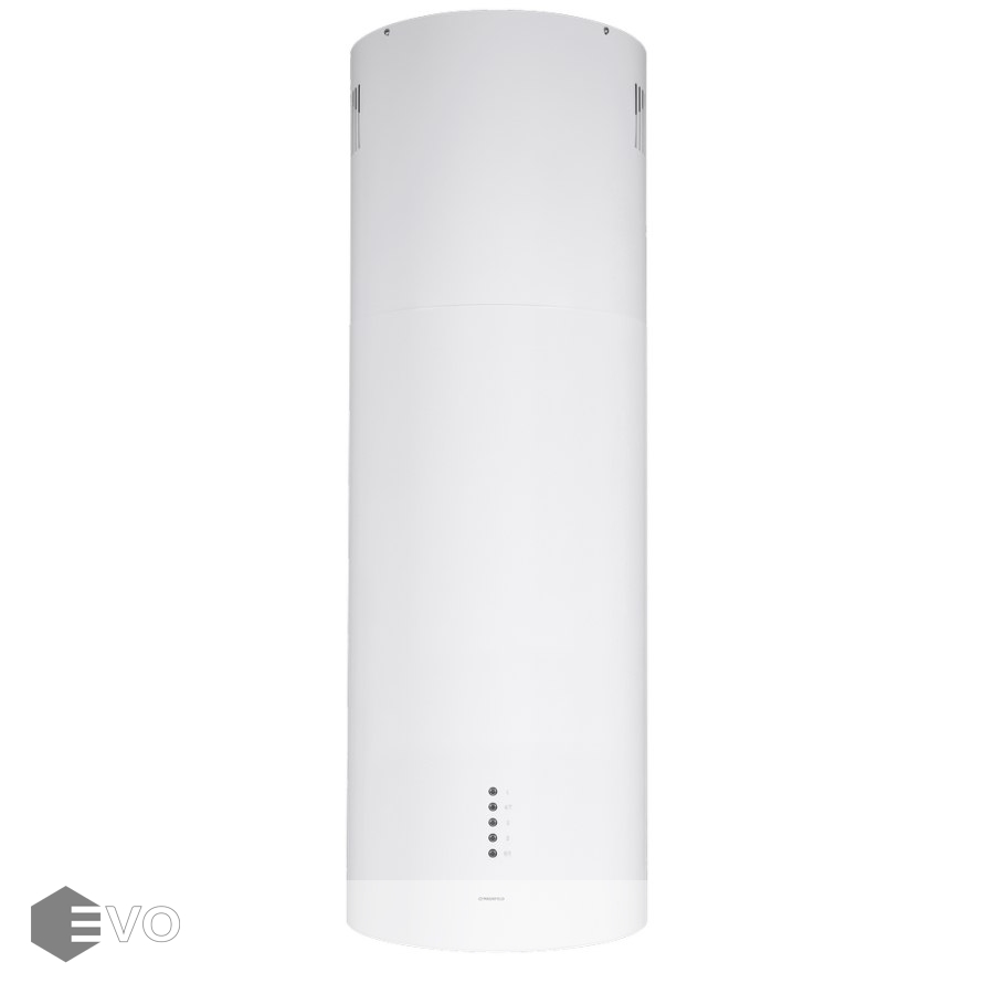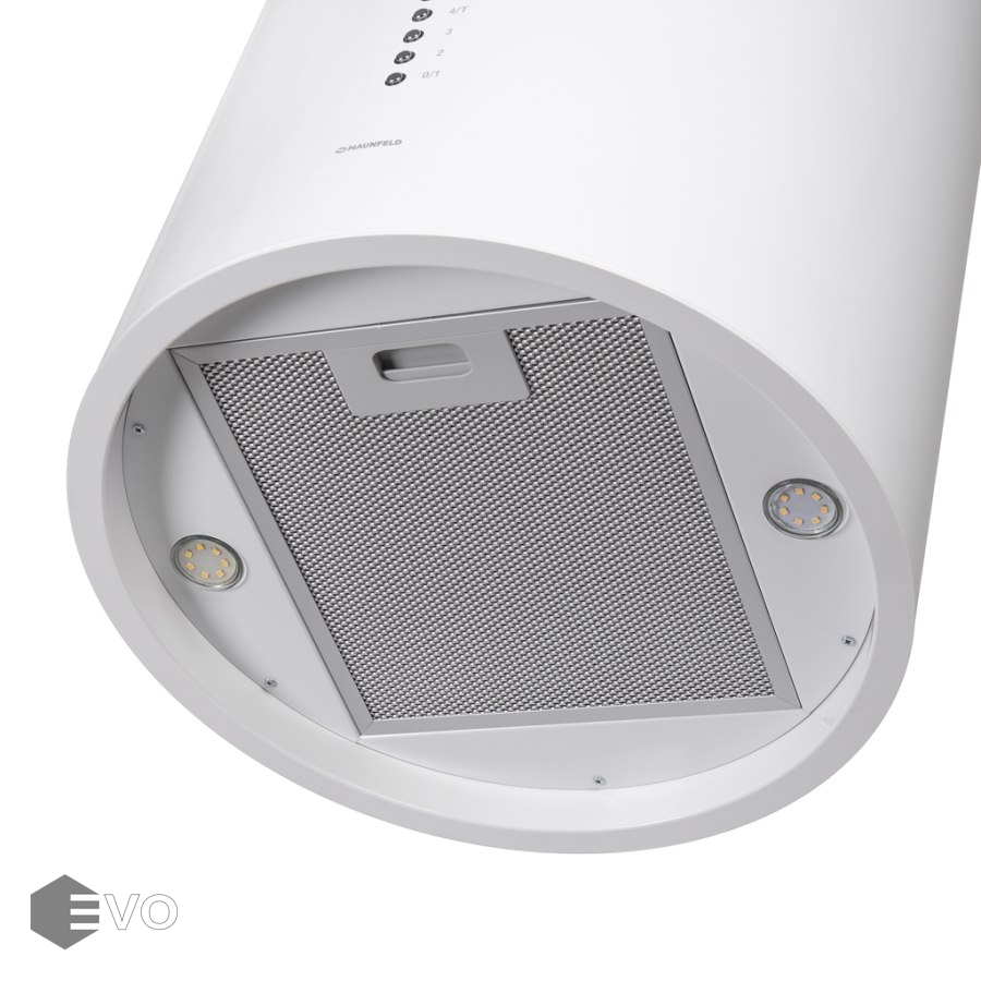 Корпус цилиндрической формы, выполненный из нержавеющей стали, крепится на потолок над поверхностью плиты. В нижней части вытяжки находится алюминиевый многослойный жироулавливающий фильтр. Сенсорное управление с подсветкой позволит выбрать один из 4-х режимов работы вентилятора, выставить таймер и включить 2 светодиодные лампочки (2,2 Вт), расположенные по бокам от фильтра.