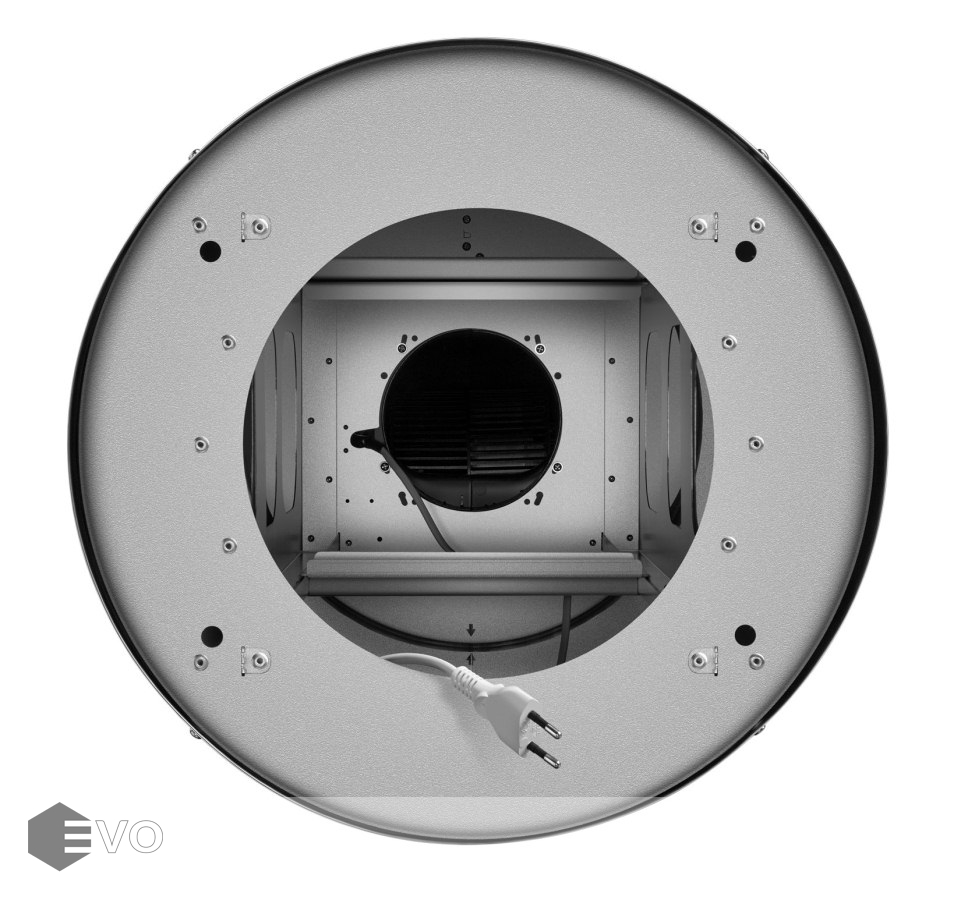 Корпус цилиндрической формы, выполненный из нержавеющей стали, крепится на потолок над поверхностью плиты. В нижней части вытяжки находится алюминиевый многослойный жироулавливающий фильтр. Сенсорное управление с подсветкой позволит выбрать один из 4-х режимов работы вентилятора, выставить таймер и включить 2 светодиодные лампочки (2,2 Вт), расположенные по бокам от фильтра.