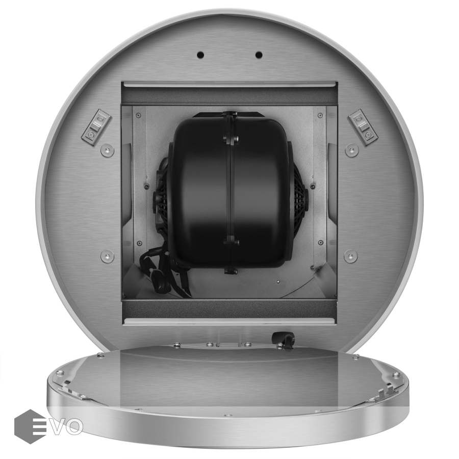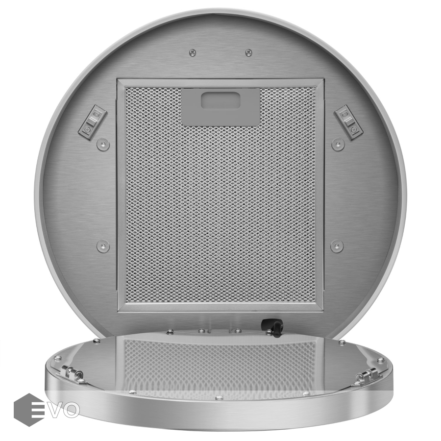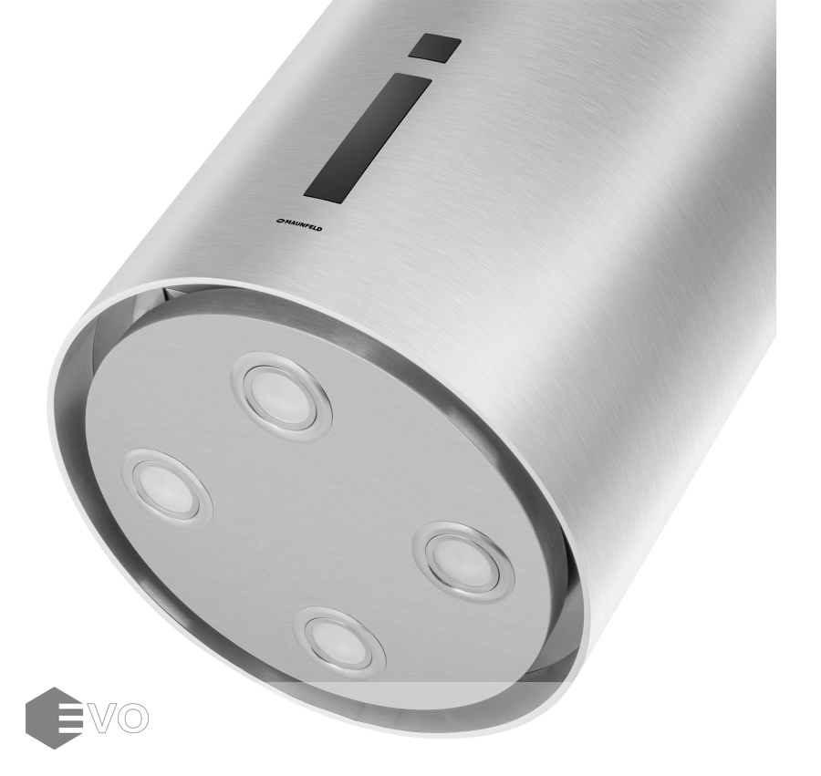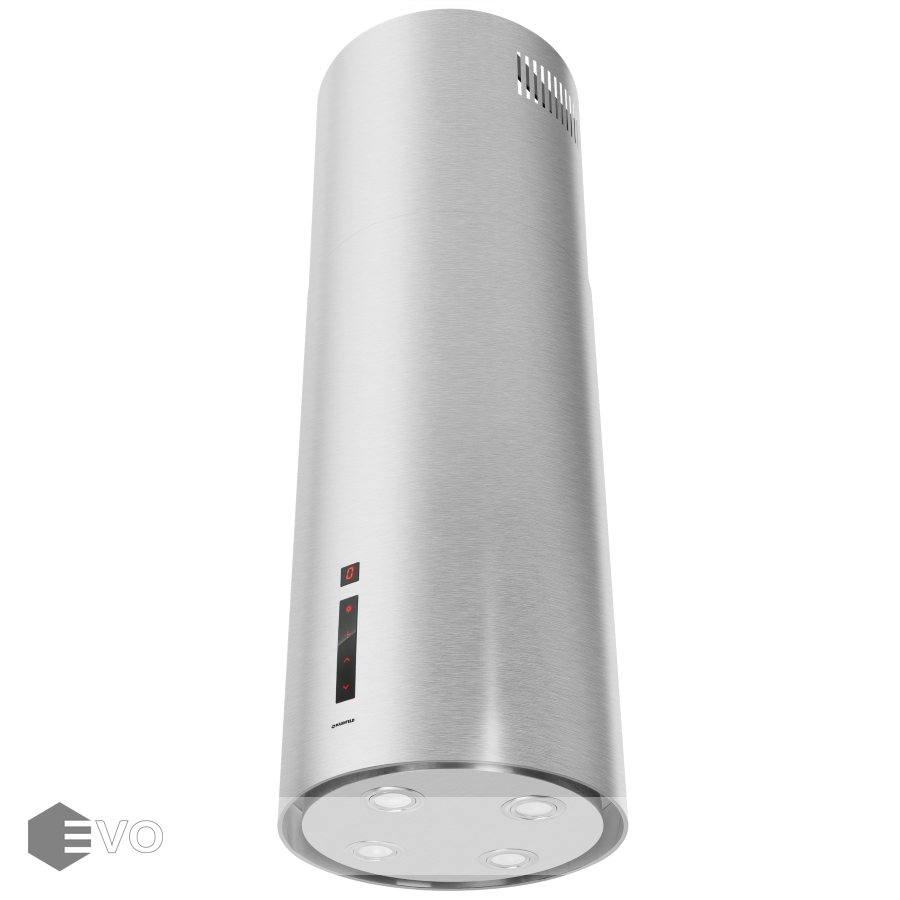 Корпус цилиндрической формы, выполненный из нержавеющей стали, крепится на потолок над поверхностью плиты. В нижней части вытяжки находится алюминиевый многослойный жироулавливающий фильтр. Сенсорное управление с подсветкой позволит выбрать один из 4-х режимов работы вентилятора, выставить таймер и включить 4 светодиодные лампочки (2,2 Вт), расположенные по бокам от фильтра.