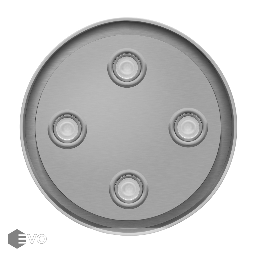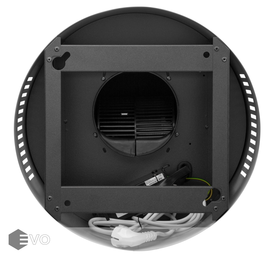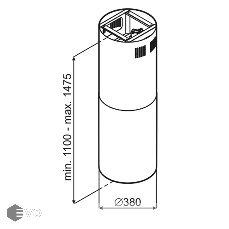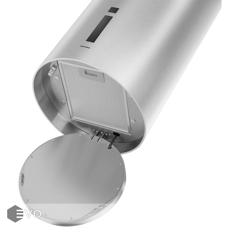 Корпус цилиндрической формы, выполненный из нержавеющей стали, крепится на потолок над поверхностью плиты. В нижней части вытяжки находится алюминиевый многослойный жироулавливающий фильтр. Сенсорное управление с подсветкой позволит выбрать один из 4-х режимов работы вентилятора, выставить таймер и включить 4 светодиодные лампочки (2,2 Вт), расположенные по бокам от фильтра.