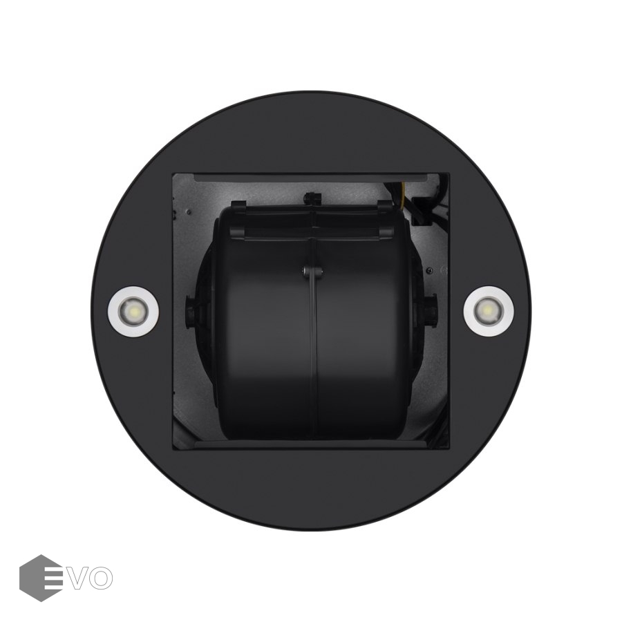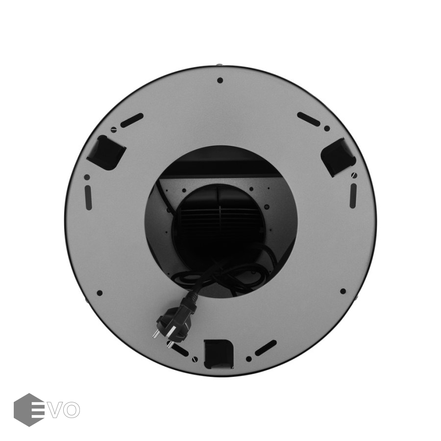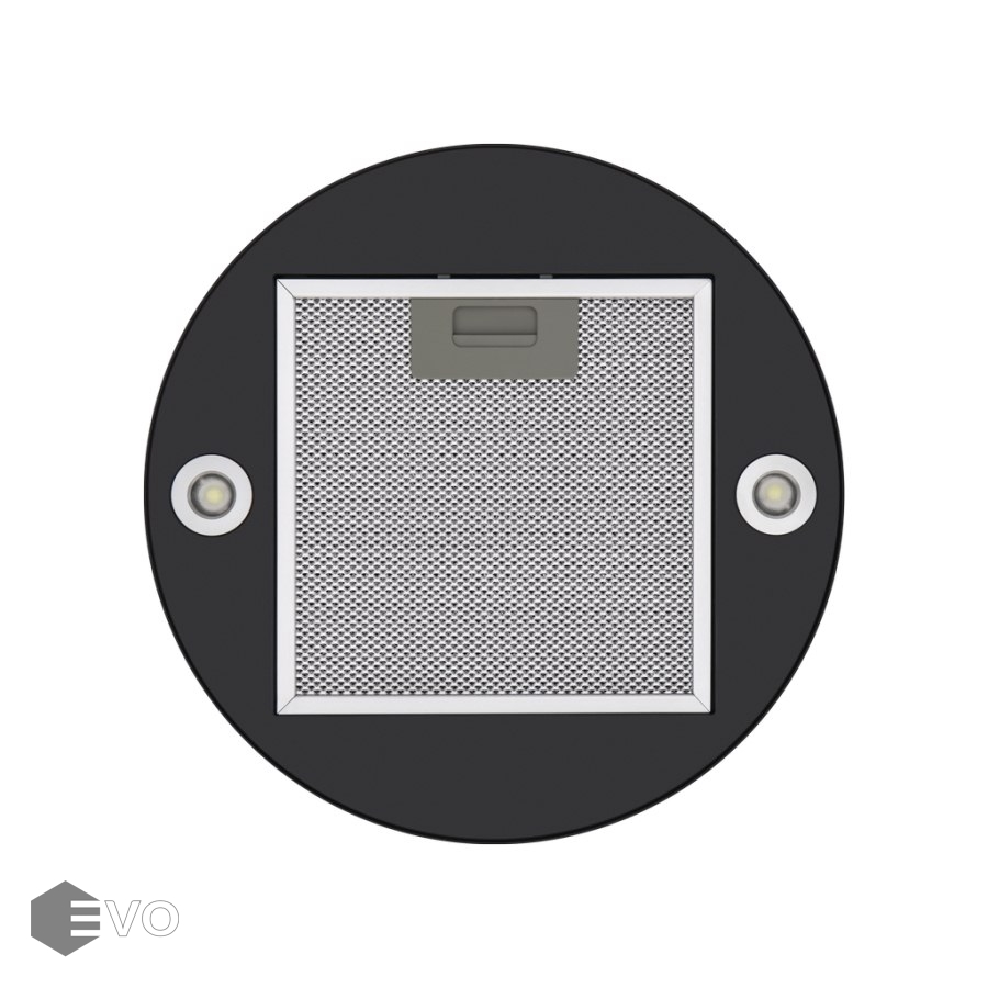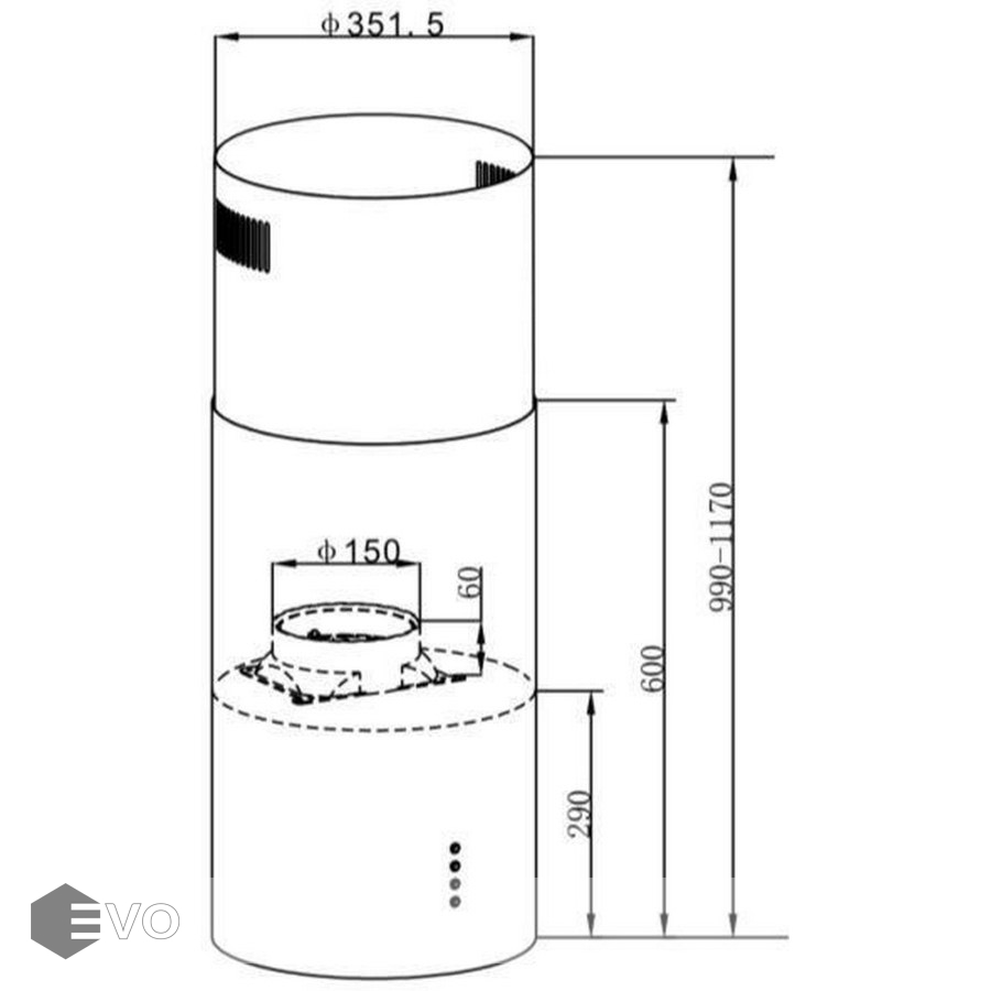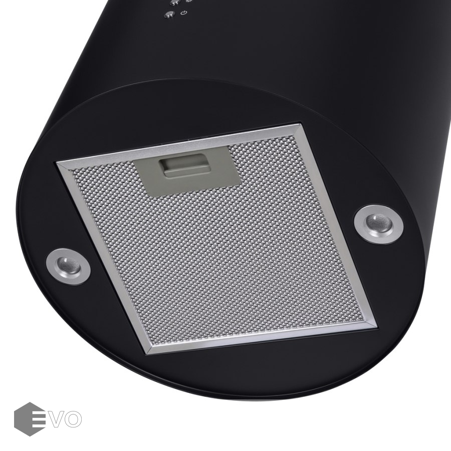 Корпус цилиндрической формы, выполненный из нержавеющей стали с термостойким покрытием белого цвета, крепится на потолок над поверхностью плиты. Алюминиевый многослойный жироулавливающий фильтр находится в нижней части вытяжки.