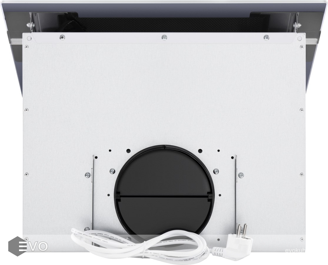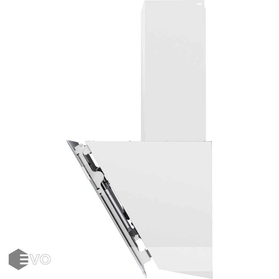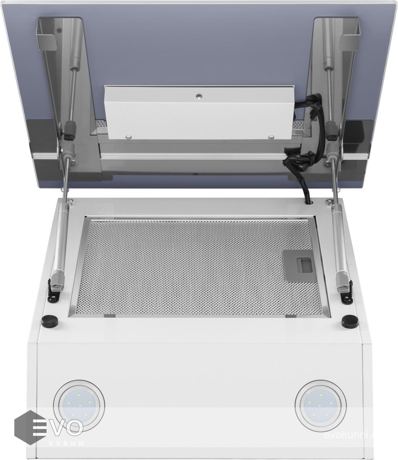 Корпус сделан из нержавеющей стали. Откидная панель выполнена из глянцевого  закаленного белого стекла с матированной металлической вставкой и оснащена магнитными фиксаторами и газовыми амортизаторами. За ней скрывается легко снимающийся  алюминиевый  жироулавливающий фильтр. Загрязненный воздух втягивается по периметру откидной панели.