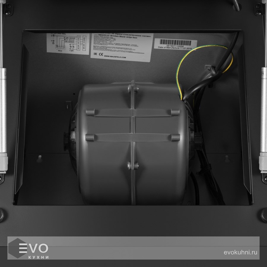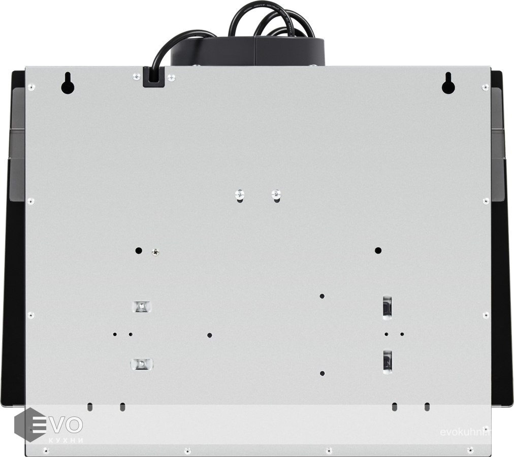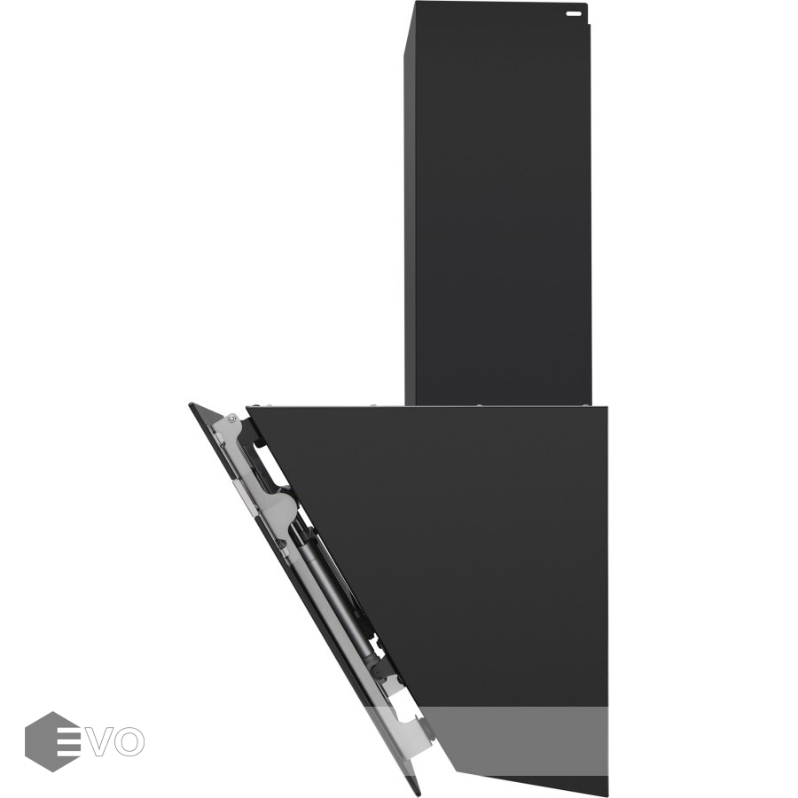 Корпус сделан из нержавеющей стали. Откидная панель выполнена из глянцевого закаленного черного стекла с матированной металлической вставкой и оснащена магнитными фиксаторами и газовыми амортизаторами. За ней скрывается легко снимающийся алюминиевый жироулавливающий фильтр. Загрязненный воздух втягивается по периметру откидной панели.