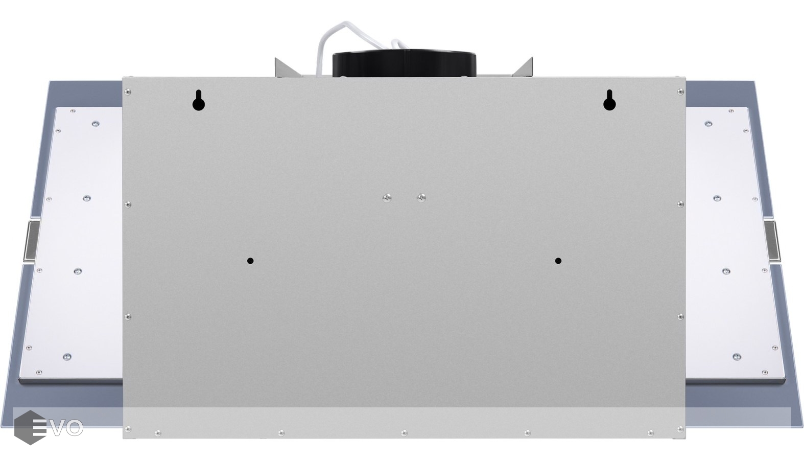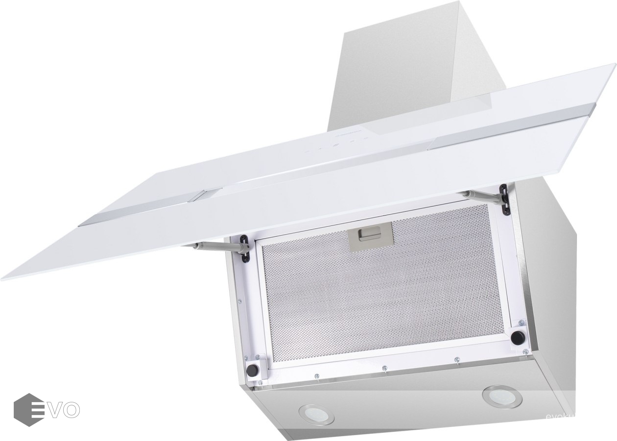 Корпус выполнен из матированной нержавеющей стали. Откидной фасад из закаленного глянцевого стекла белого цвета украшен стальными вставками. Загрязненный воздух втягивается по всему периметру панели через алюминиевый жироулавливающий фильтр, который легко снимается и полностью разбирается, что сильно упрощает его чистку. Особое внимание заслуживает система фиксации откидной панели - это газ-лифты и магнитные защелки.