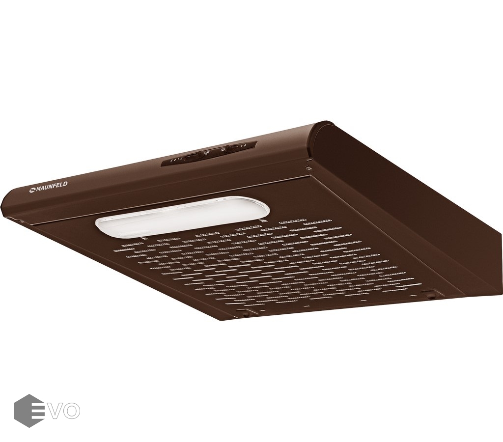 Козырьковая подвесная вытяжка MAUNFELD MPA 60 коричневый – подвесная кухонная вытяжка шириной 60 см, подойдет для небольшой кухни (до 12 кв. м). Может использоваться для отвода воздуха из помещения при подключении к системе домовой вентиляции или очищать воздух с помощью сменного угольного фильтра. Управление работой с помощью ползункового переключателя расположенного на торце вытяжки, позволяет выбрать одну из 3-х скоростей работы вентилятора и включить освещение.