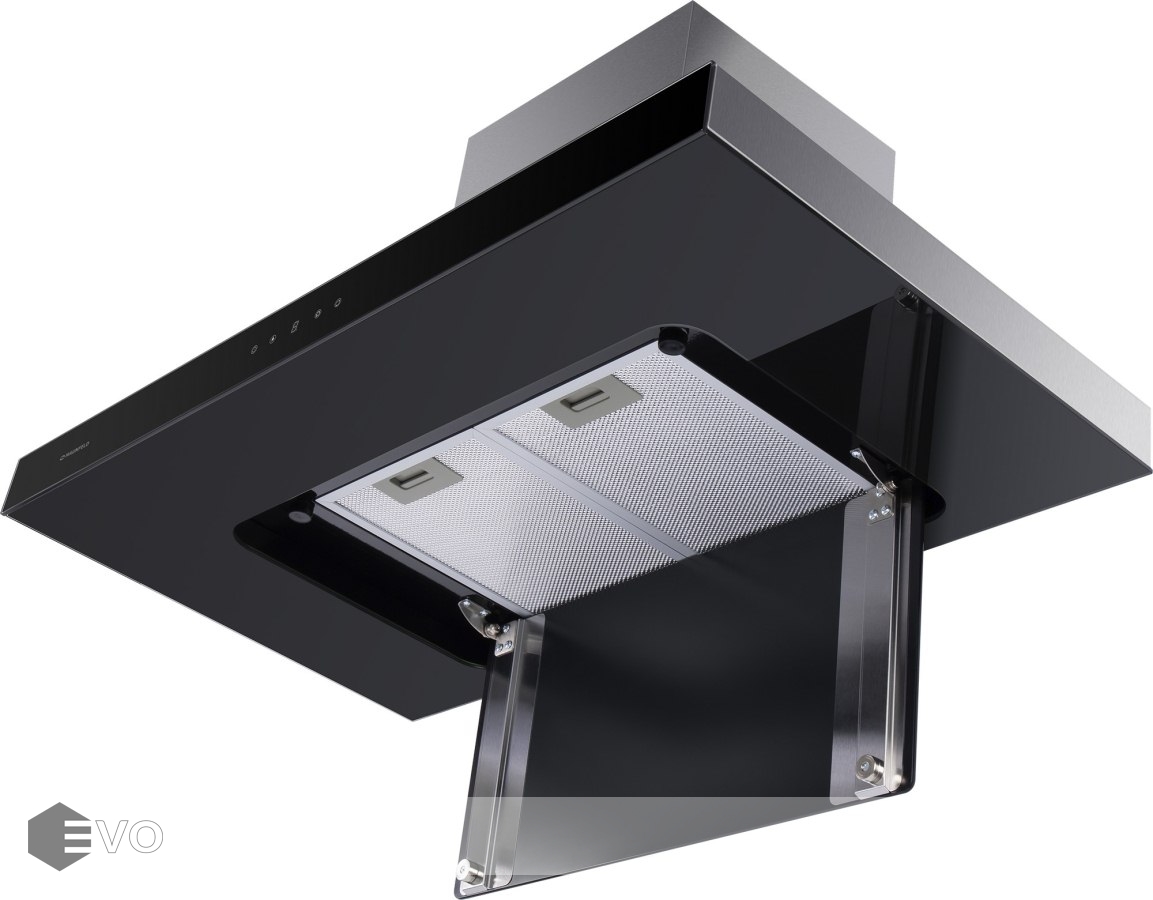 Используется только для отвода воздуха из помещения при подключении к системе домовой вентиляции. Сенсорная панель управления с дисплеем расположена по центру фасада, также выполненного из закаленного стекла. Корпус сделан из нержавеющей стали. Рабочая поверхность и откидная панель выполнены из закаленного глянцевого стекла черного цвета. За панелью расположен многослойный жироулавливающий алюминиевый фильтр, который при необходимости можно легко вынуть из вытяжки.