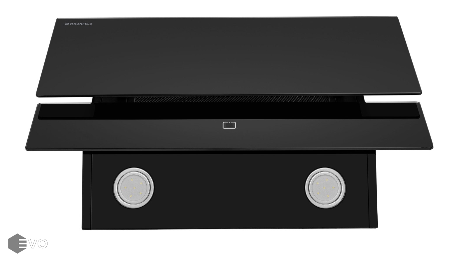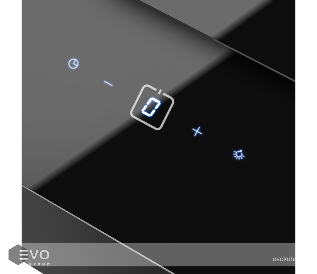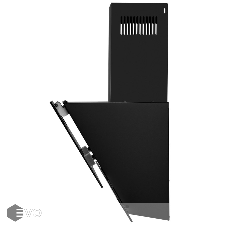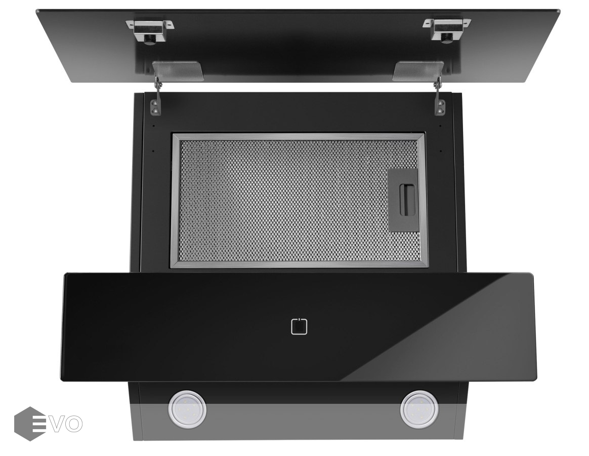 Корпус, выполненный из нержавеющей стали с покрытием черного цвета, эффектно дополняет фасад из 2-х закаленных стеклянных пластин. За верхней откидной пластиной скрыт легко снимающийся жироулавливающий алюминиевый фильтр. В модели реализован периметрический принцип втягивания загрязненного воздуха. Сенсорное управление с дисплеем располагается в нижней части фасада. Можно выбрать одну из 3-х скоростей (две основные и одна экстренная для быстрого очищения воздуха), активировать таймер отключения вытяжки на 9 мин и включить свет (2 мощных светодиодных элемента по 2 Вт).