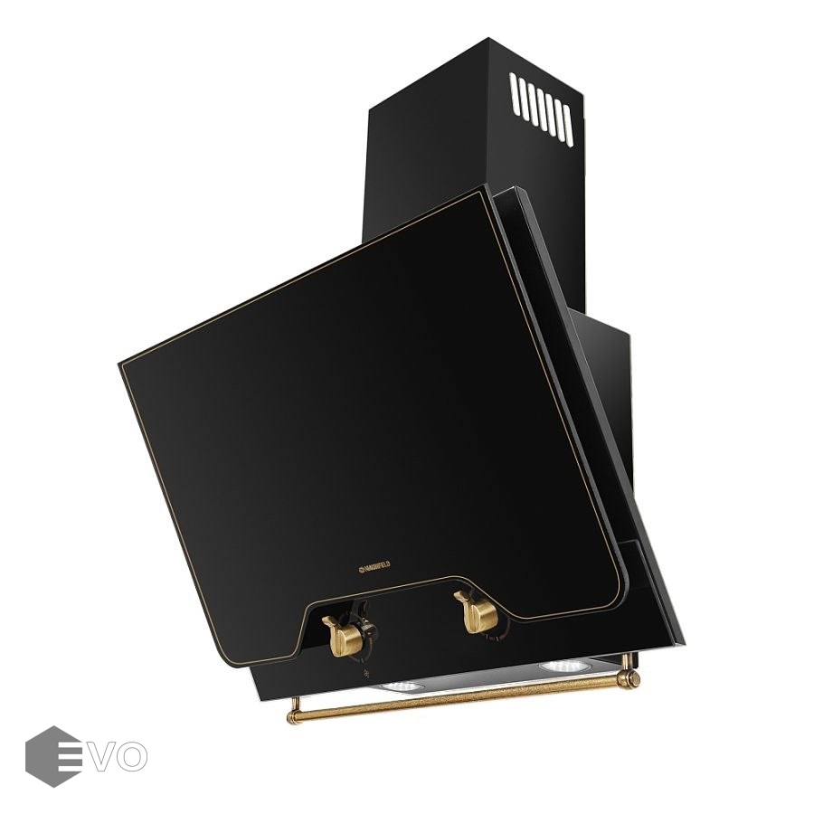 Работает в двух режимах – отвода (при подключении к системе вентиляции) и рециркуляции (при использовании сменного угольного фильтра). Корпус выполнен из нержавеющей стали с эмалированным покрытием матового черного цвета. Стильный откидной фасад из черного закаленного стекла прекрасно сочетается с ручками и рейлингом золотого цвета. За фасадом скрыт многослойный алюминиевый жироулавливающий фильтр, который легко снимается и полностью разбирается, что сильно упрощает чистку.