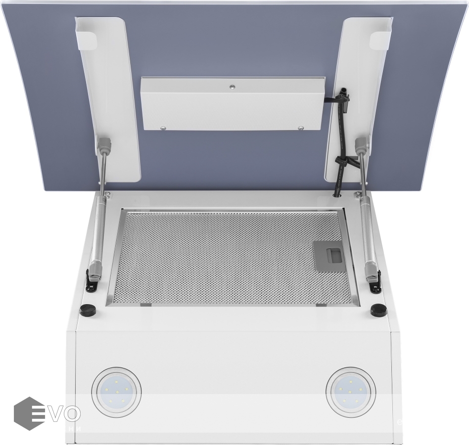 Корпус выполнен из нержавеющей стали с высококачественным эмалированным покрытием. Откидная фронтальная панель имеет оригинальную изогнутую форму, которая особенно удачно выглядит в исполнении из глянцевого закаленного стекла. За ней скрыт алюминиевый жироулавливающий фильтр, легко вынимающийся для чистки. Особое внимание заслуживает система фиксации откидной панели — это газлифты и магнитные защелки.