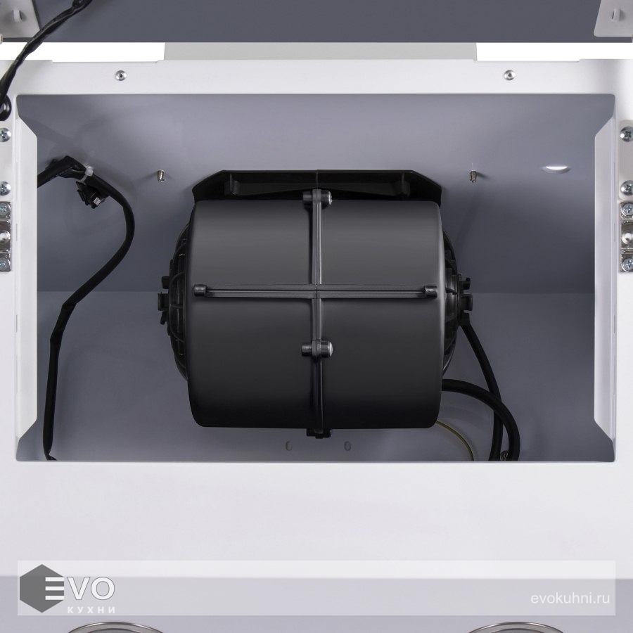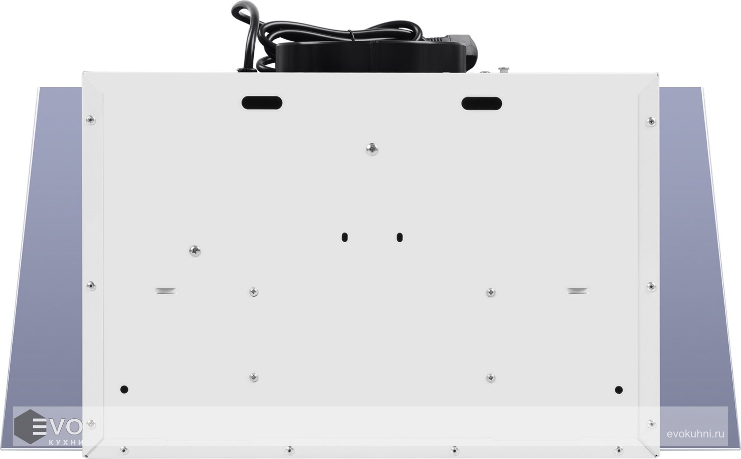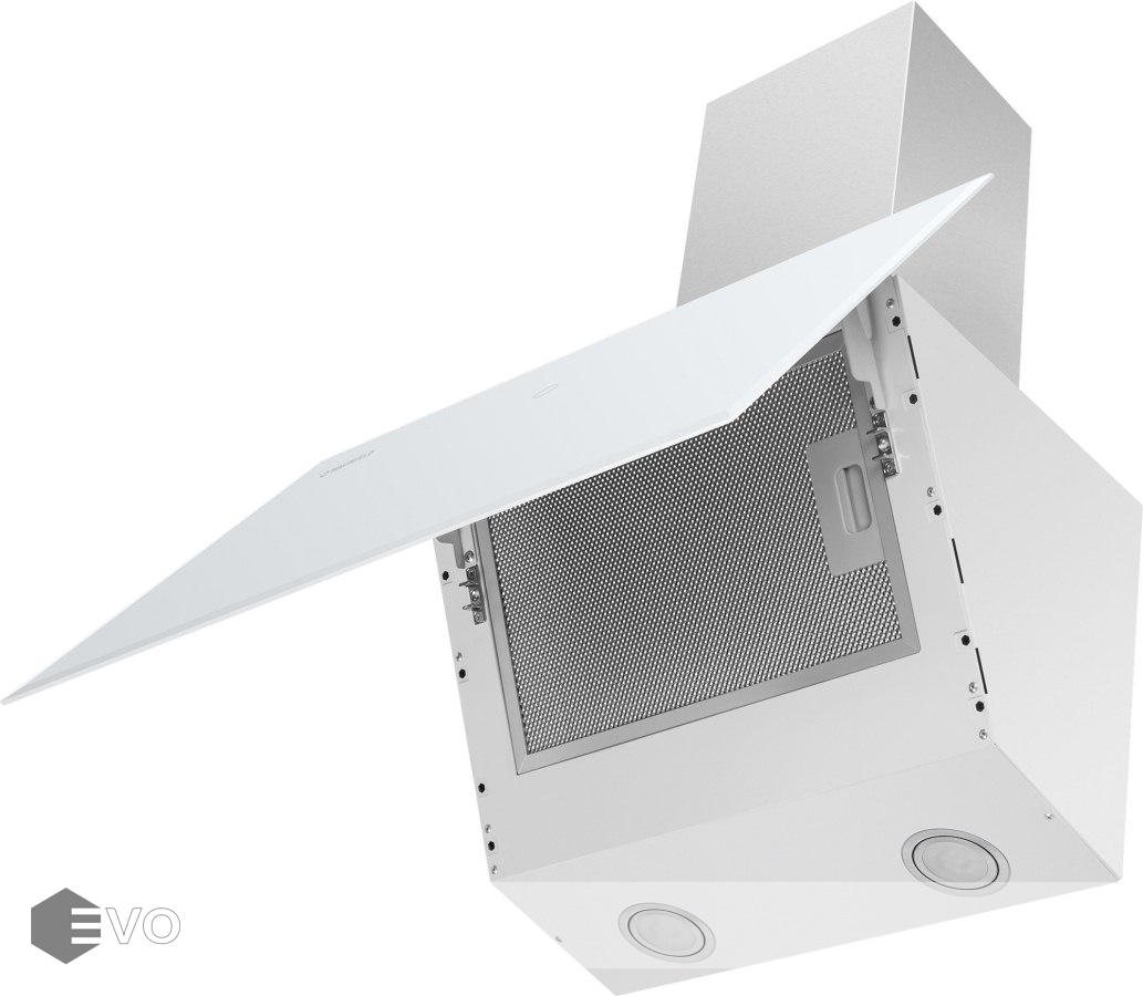 Корпус выполнен из нержавеющей стали. Откидная панель, выполненная из закаленного белого цвета с фацетом, скрывает легко снимающийся алюминиевый жироулавливающий фильтр. Загрязненный воздух втягивается по периметру всей откидной панели.