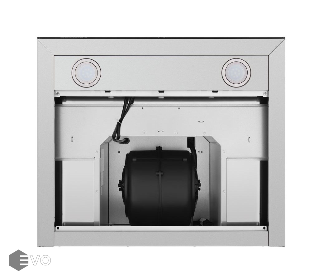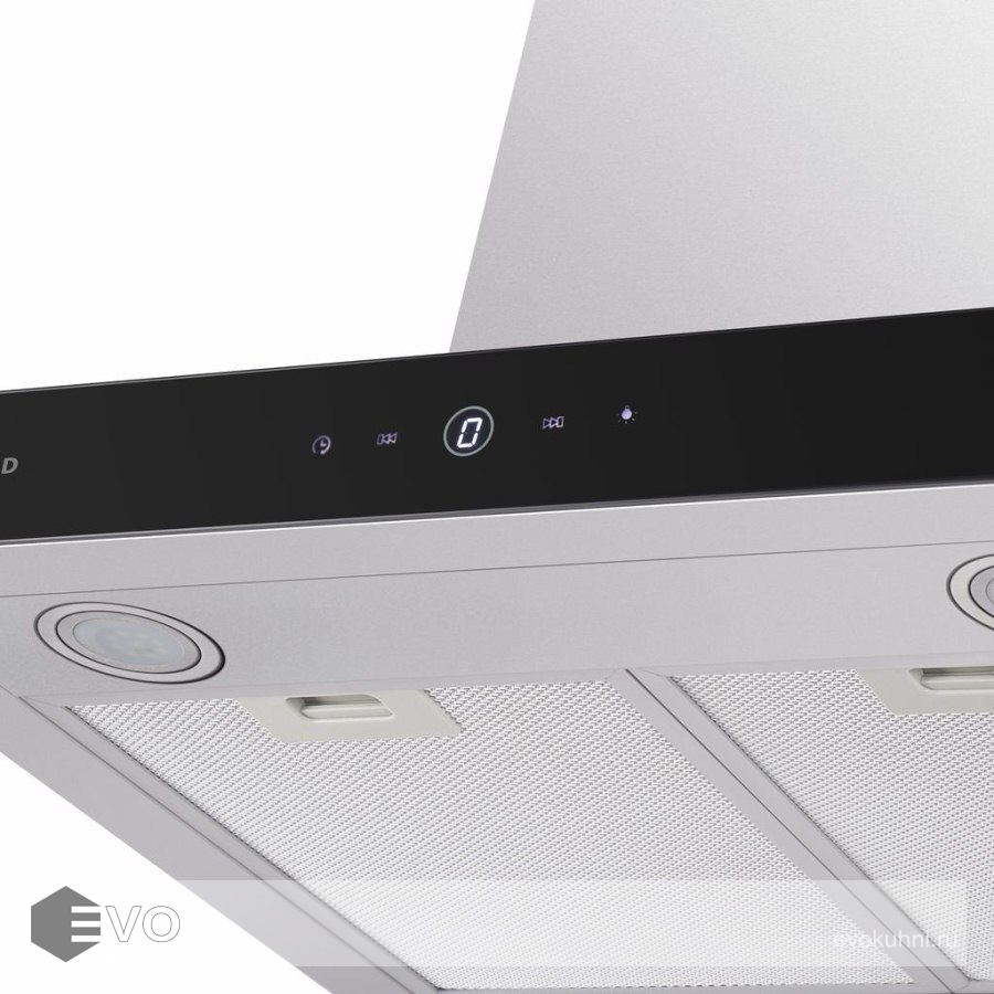 Сенсорная панель управления с дисплеем находится на фасаде, выполненном из закаленного стекла черного цвета. Можно выбрать один из 3-х скоростных режимов работы, установить таймер для выключения вытяжки и активировать светодиодную подсветку (2 светильника по 1,5 Вт).