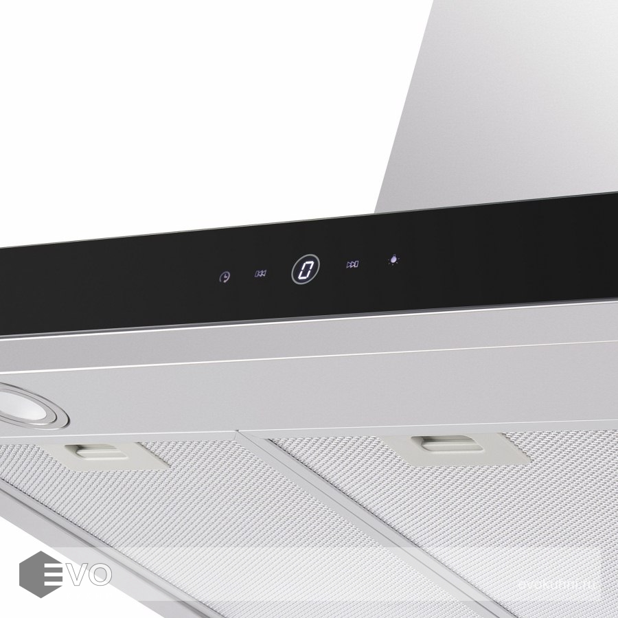 Сенсорная панель управления с дисплеем находится на фасаде, выполненном из закаленного стекла черного цвета. Можно выбрать один из 3-х скоростных режимов работы, установить таймер для выключения вытяжки и активировать светодиодную подсветку (2 светильника по 1,5 Вт).