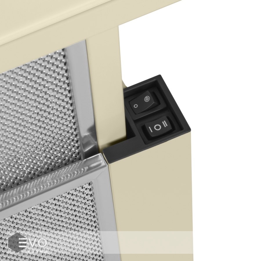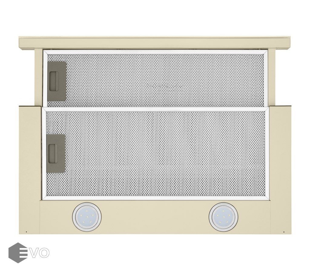 Корпус сделан из нержавеющей стали с высококачественным покрытием бежевого цвета. Фасадная панель из высокопрочного закаленного стекла выполнена в цвет корпуса. Два многослойных жироулавливающих фильтра из алюминия легко вынимаются из вытяжки и полностью разбираются, что сильно упрощает их чистку. Управление вытяжкой осуществляется двумя клавишными переключателями, скрытых в торце рабочей панели. Вы можете выбрать одну из 2-х скоростей вентилятора и включить освещение.