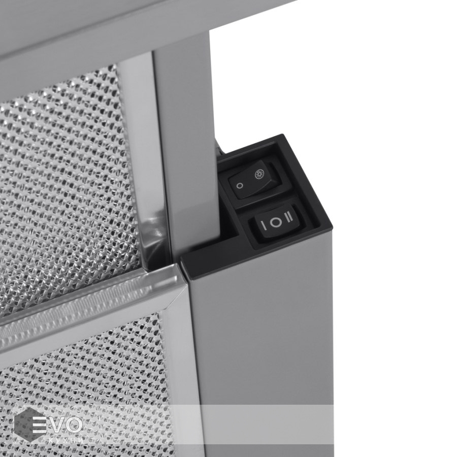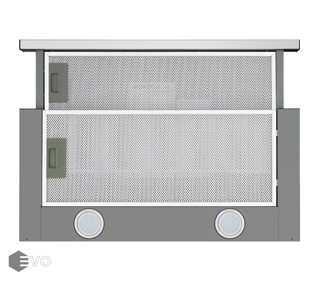 Вытяжка сделана из матированной нержавеющей стали. На основной рабочей и выдвижной панели находятся многослойные жироулавливающие фильтры, выполненные из алюминия. Они легко вынимаются и полностью разбираются, что сильно упрощает их чистку. Управление вытяжкой осуществляется двумя клавишными переключателями, скрытых в торце рабочей панели. Вы можете выбрать одну из 2-х скоростей вентилятора и включить освещение.
