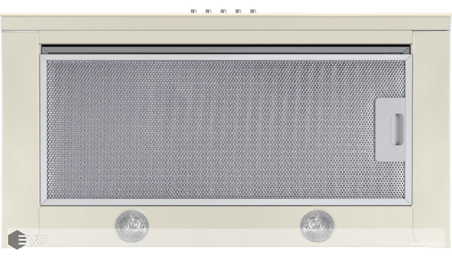 Корпус сделан из нержавеющей стали. Фронтальная и выдвижная панели выполнены в бежевом цвете. Два многослойных жироулавливающих фильтра из алюминия легко вынимаются из вытяжки и полностью разбираются, что сильно упрощает их чистку. Кнопочное управление располагается по центру фасада. Предусмотрено 3 скорости работы вентилятора и яркая подсветка рабочей поверхности.
