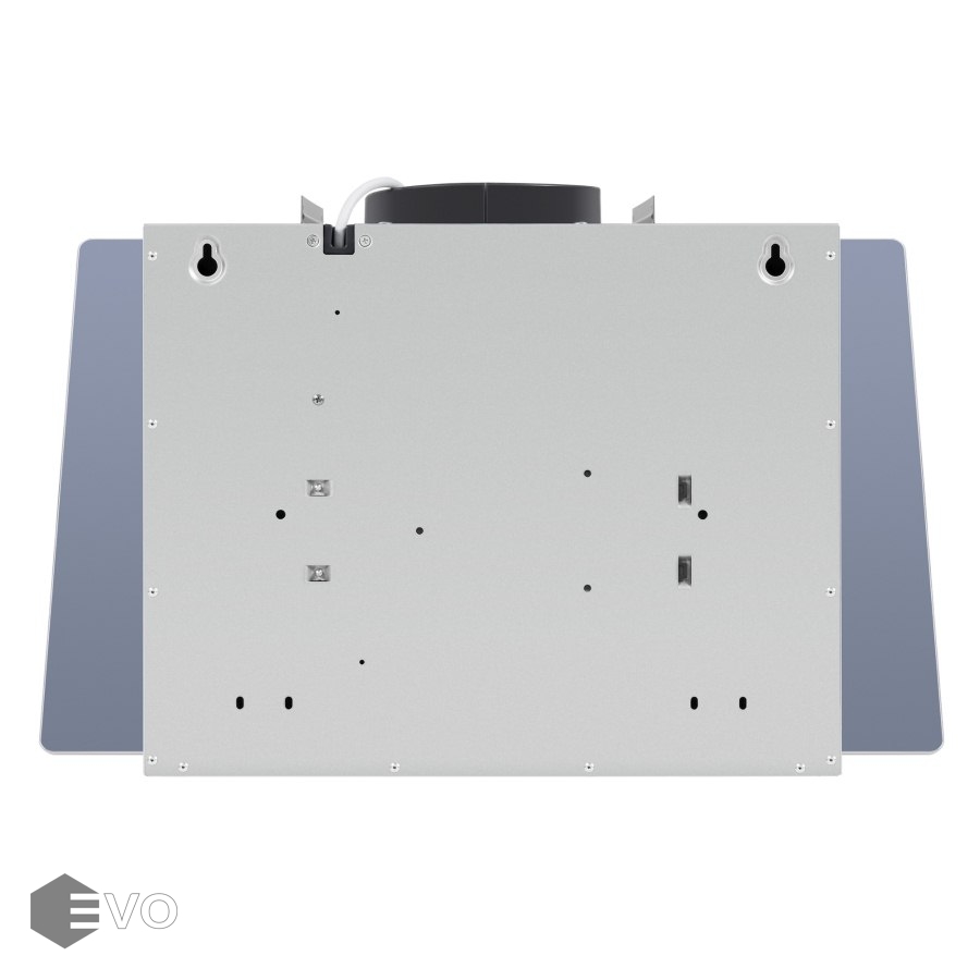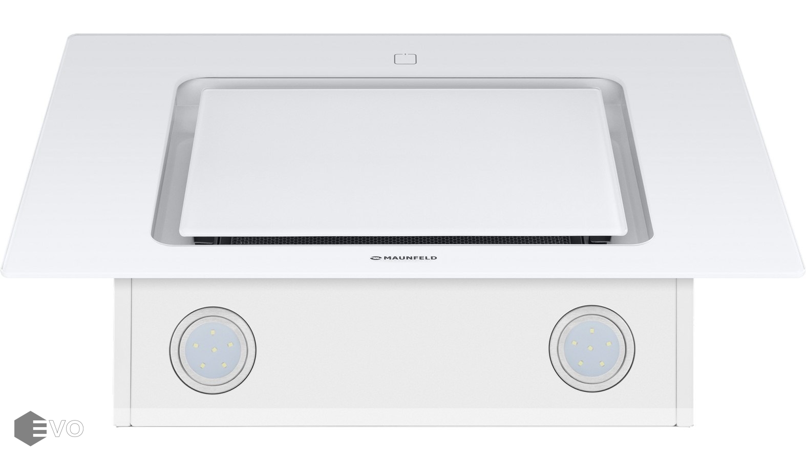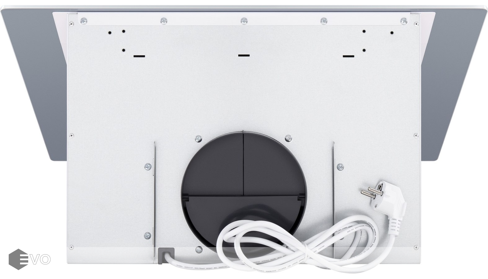 Корпус из нержавеющей стали с покрытием белого цвета удачно сочетается с фасадом, выполненным из закаленного стекла. Откидная панель расположена по центру фасада и скрывается металлический  жироулавливающий фильтр, который легко вынимается и полностью разбирается для чистки. В данной модели реализовано  периметральное втягивание загрязненного воздуха.
