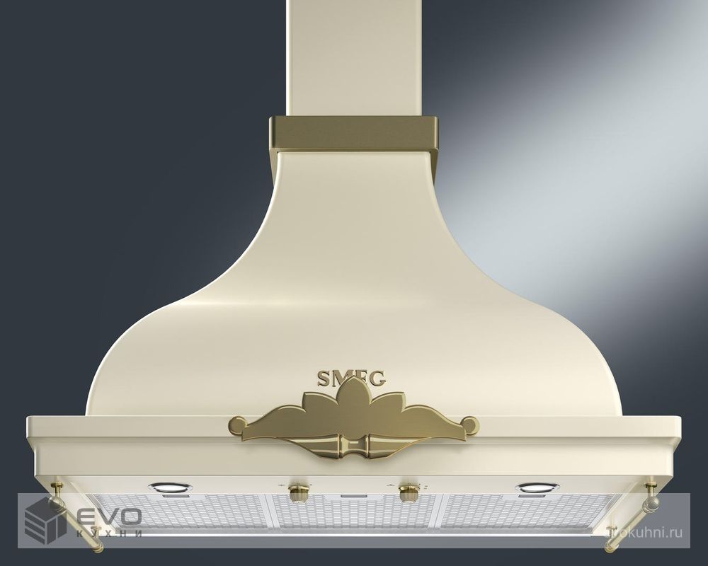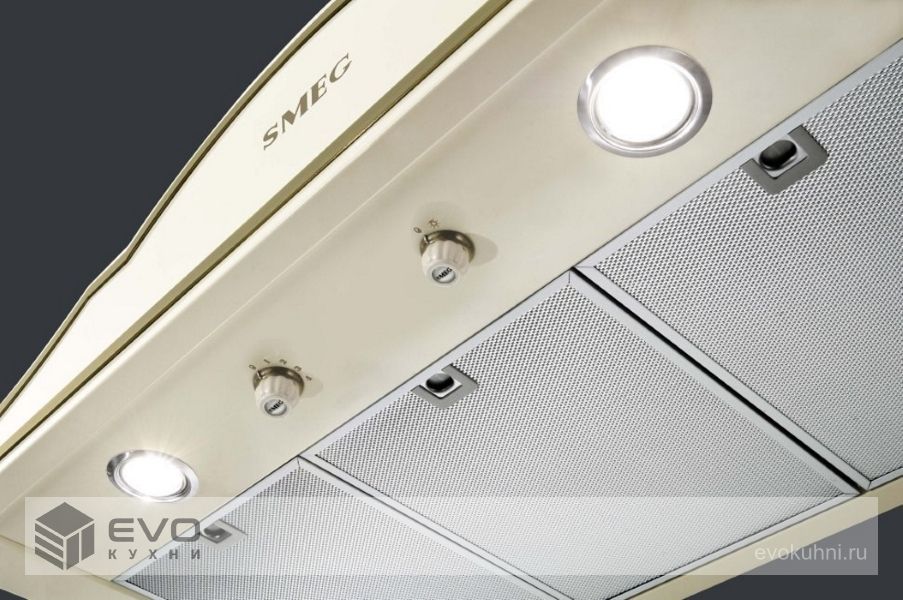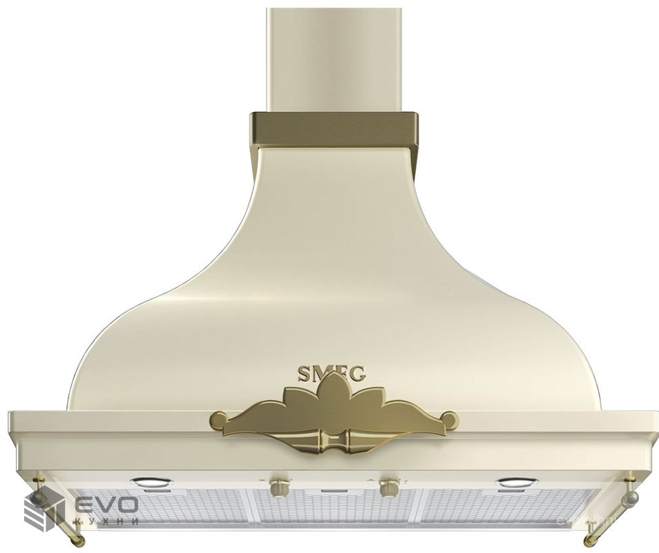 Купольная вытяжка Smeg KCM900POE – вытяжка гармонично сочетается с духовыми шкафами и варочными панелями в ретро-дизайне. Фурнитура цвета «латунь» подчеркивает эстетичный внешний вид модели. Две светодиодные лампы обеспечивают оптимальную освещенность рабочей поверхности. Конструкция прибора предусматривает интенсивный режим, что повышает комфорт эксплуатации.