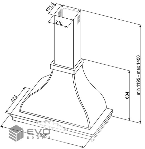 Вытяжка купольного типа шириной 90 см способна работать в режиме отвода и рециркуляции. Устройство крепится на стену, для работы в режиме отвода с удалением загрязненного воздуха за пределы помещения необходим воздуховод диаметром 150 мм. Для изготовления внешней обшивки корпуса использовался инновационный теплоформованный полимер — безопасный негорючий материал, простой в очистке, гигиеничный и термостойкий.